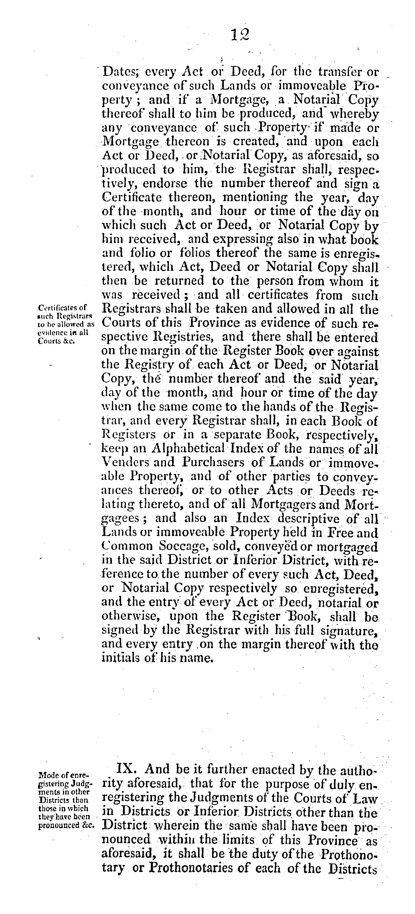 Bill (du Conseil législatif) pour rendre spéciales toutes hypothèques sur toutes terres et autres propriétés immeubles qui sont maintenant ou pourront être tenues à l'avenir en franc et commun soccage dans cette province, et pour l'établissement de bureaux d'enrégistrement pour tous contrats et hypothèques relatifs à telles propriétés en icelle
