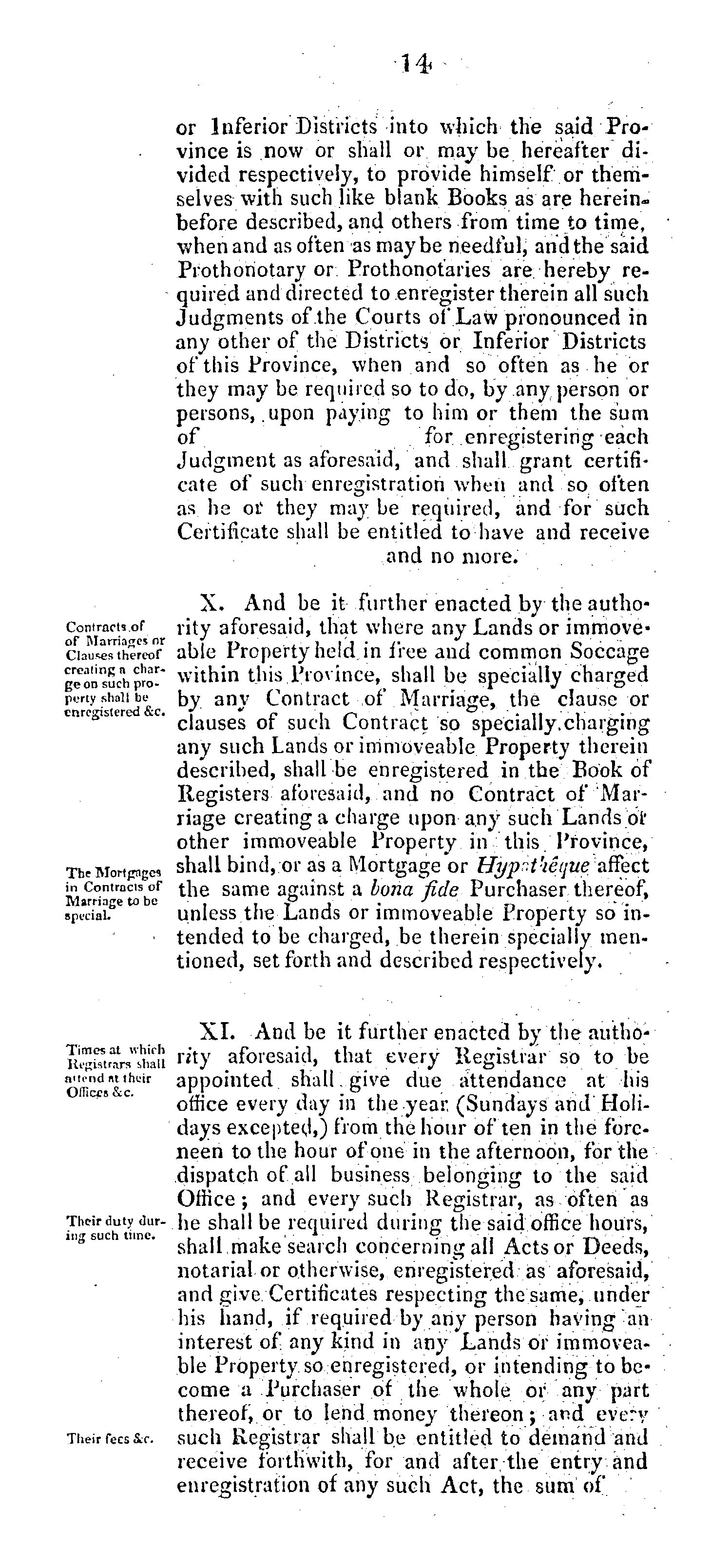 Bill (du Conseil législatif) pour rendre spéciales toutes hypothèques sur toutes terres et autres propriétés immeubles qui sont maintenant ou pourront être tenues à l'avenir en franc et commun soccage dans cette province, et pour l'établissement de bureaux d'enrégistrement pour tous contrats et hypothèques relatifs à telles propriétés en icelle