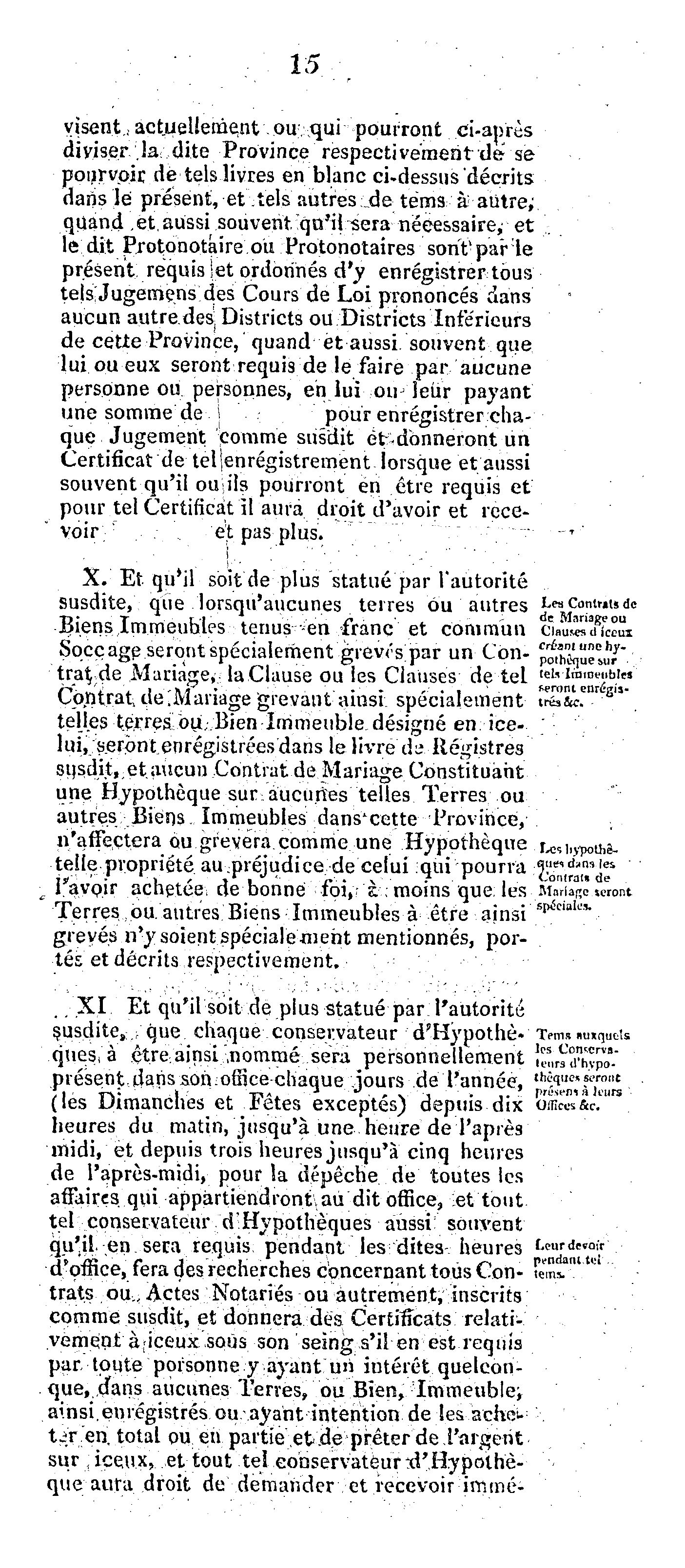 Bill (du Conseil législatif) pour rendre spéciales toutes hypothèques sur toutes terres et autres propriétés immeubles qui sont maintenant ou pourront être tenues à l'avenir en franc et commun soccage dans cette province, et pour l'établissement de bureaux d'enrégistrement pour tous contrats et hypothèques relatifs à telles propriétés en icelle