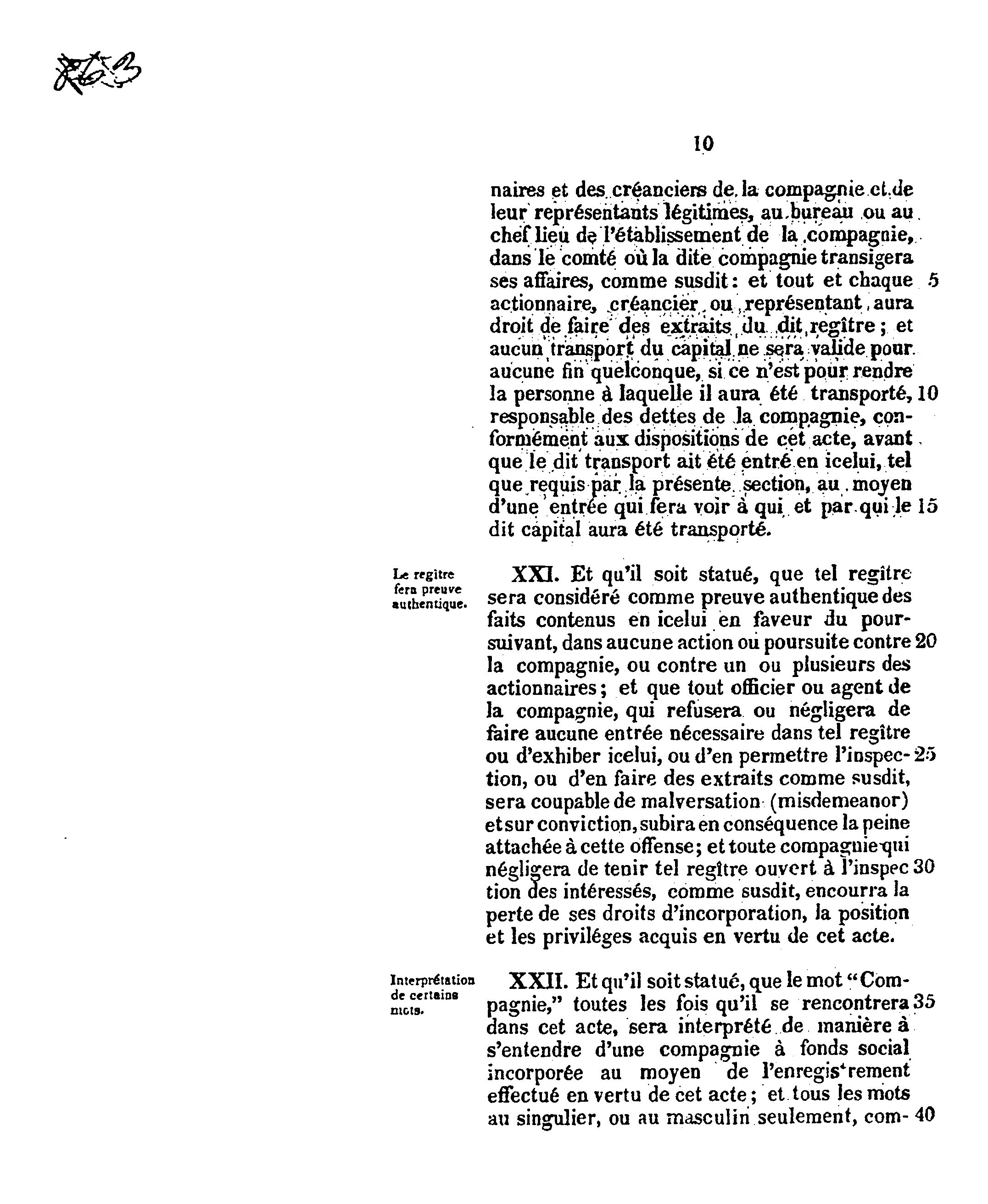 Acte pour pourvoir à la formation de compagnies incorporées à fonds social, pour des fins relatives aux manufactures, aux mines, à la mécanique ou à la chimie