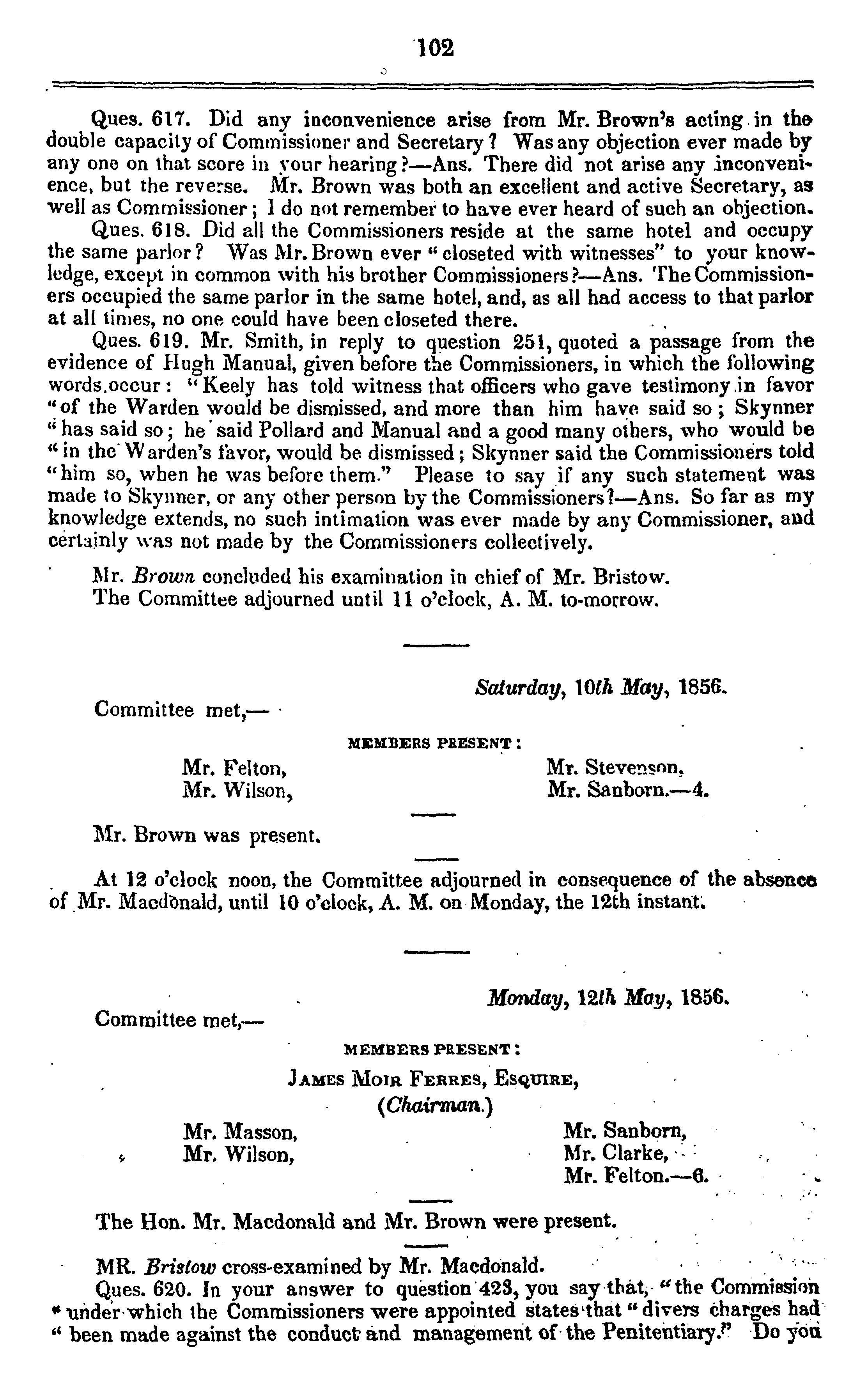 Proceedings of a committee of seven, James Moir Ferres, Chairman, recording its investigation into charges preferred by John A. Macdonald on Feb. 26, 1856, against Brown. The latter was accused of having made false records and influenced witnesses while he was acting as a member and secretary of the commission appointed to inquire into the condition of the provincial penitentiary in 1848.