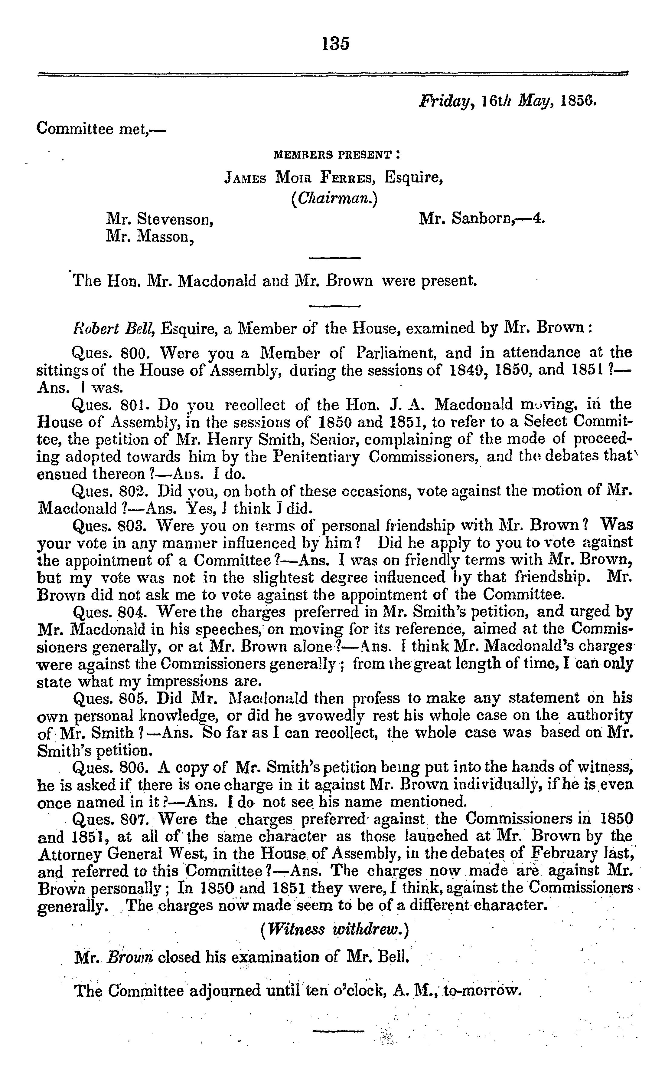 Proceedings of a committee of seven, James Moir Ferres, Chairman, recording its investigation into charges preferred by John A. Macdonald on Feb. 26, 1856, against Brown. The latter was accused of having made false records and influenced witnesses while he was acting as a member and secretary of the commission appointed to inquire into the condition of the provincial penitentiary in 1848.