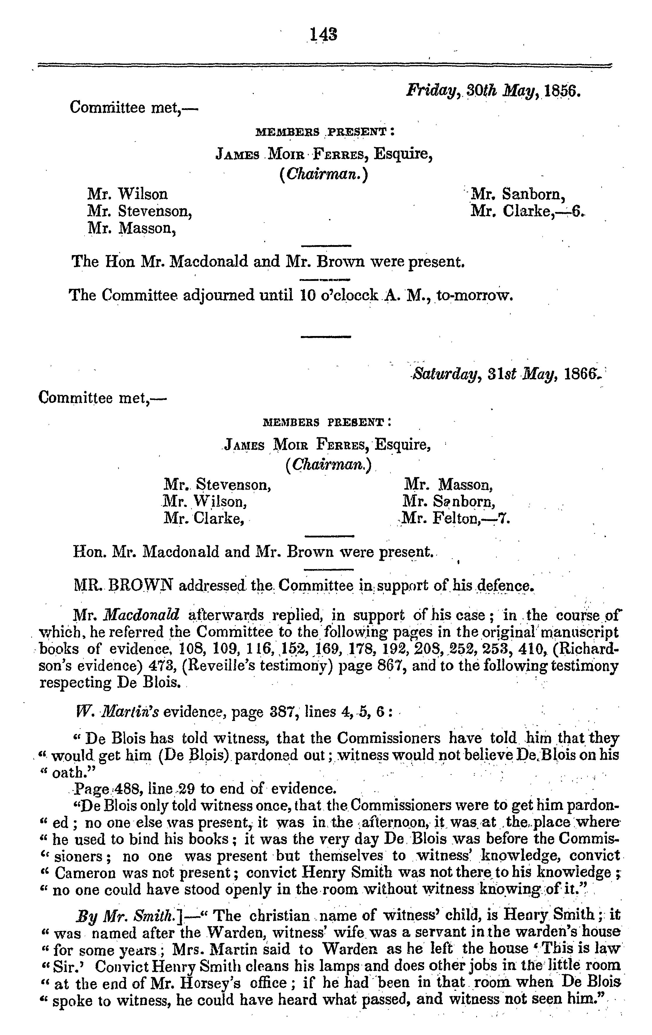 Proceedings of a committee of seven, James Moir Ferres, Chairman, recording its investigation into charges preferred by John A. Macdonald on Feb. 26, 1856, against Brown. The latter was accused of having made false records and influenced witnesses while he was acting as a member and secretary of the commission appointed to inquire into the condition of the provincial penitentiary in 1848.