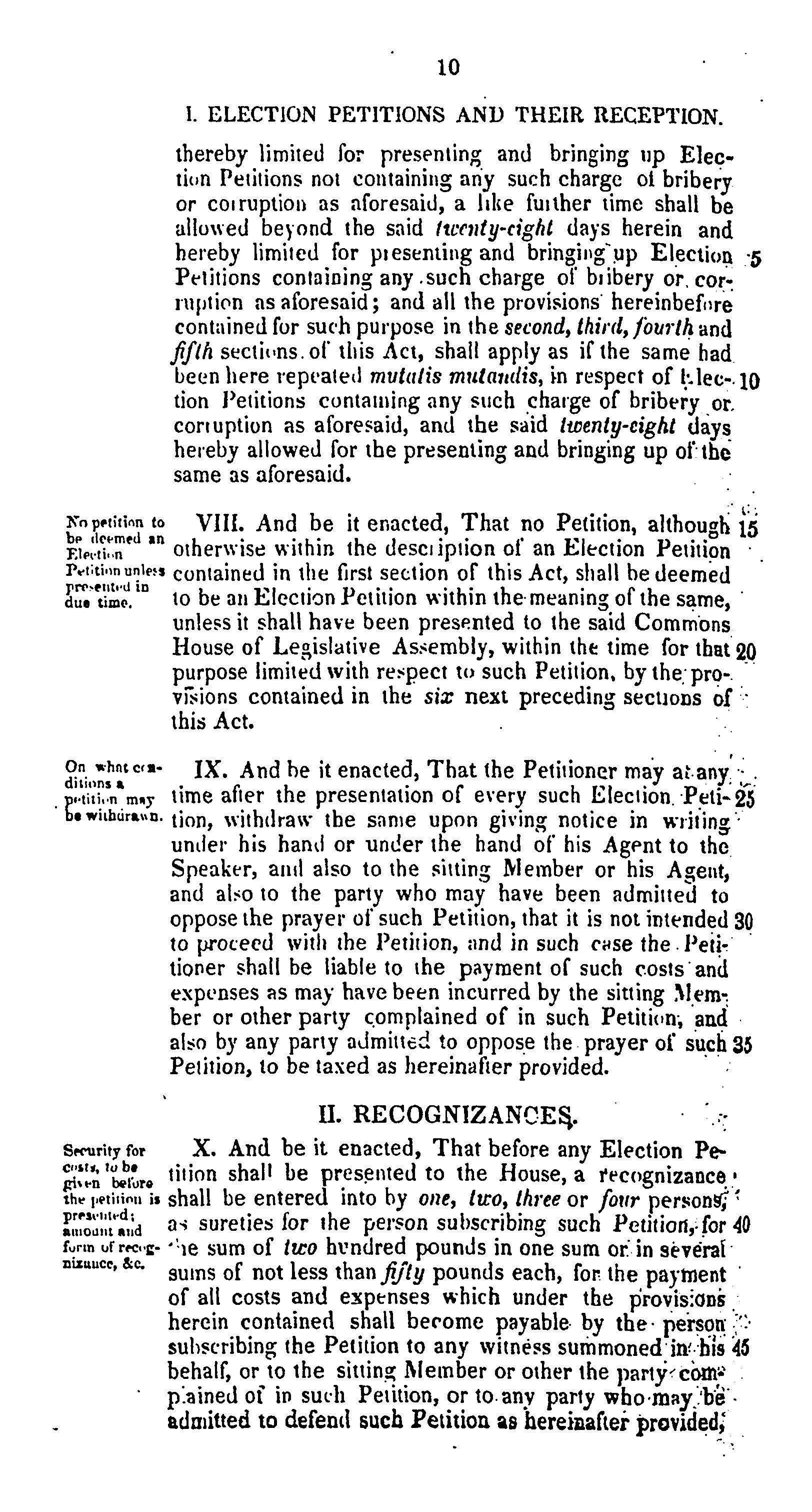Captian title: Act to repeal the several acts of the parliaments of Lower and Upper Canada now in force for the trial of controverted parliamentary elections in the two sections of the province respectively, and to provide by one general act for the trial of all parliamentary election petitions.