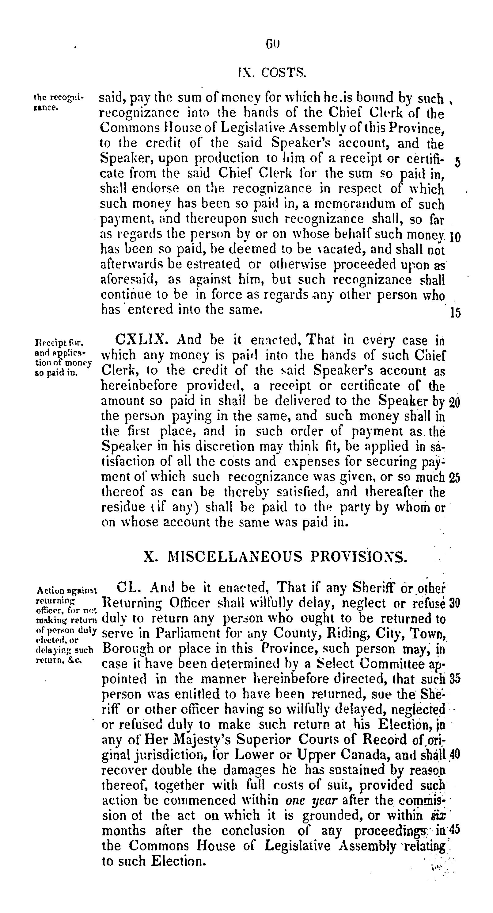 Captian title: Act to repeal the several acts of the parliaments of Lower and Upper Canada now in force for the trial of controverted parliamentary elections in the two sections of the province respectively, and to provide by one general act for the trial of all parliamentary election petitions.