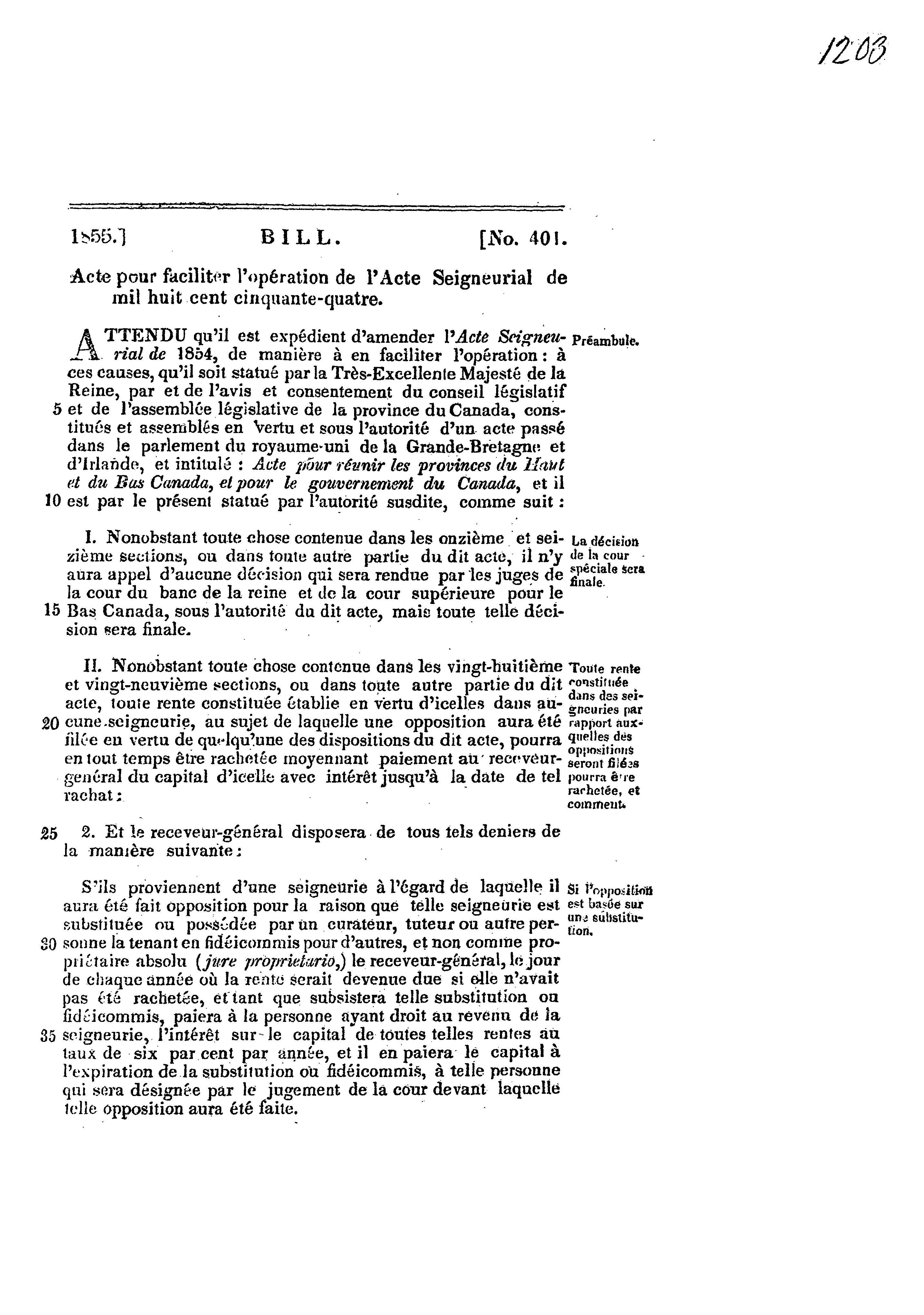 Acte pour faciliter l'opération de l'acte seigneurial de mil huit cent cinquante-quatre