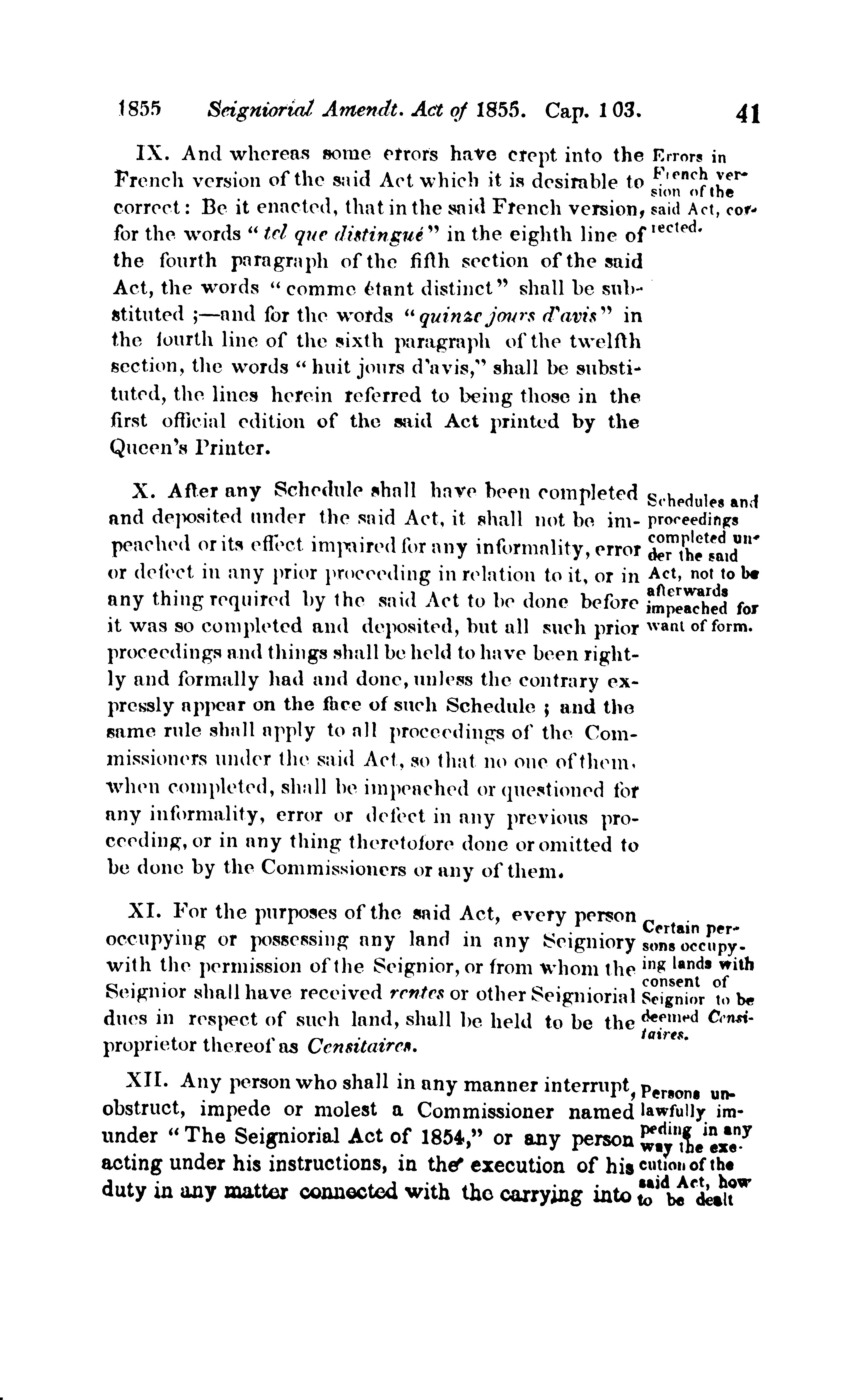The seigniorial acts : viz, the Seigniorial act of 1854, 16 Vict. cap. III, the Seigniorial amendment act of 1855, 18 Vict. cap. CIII, the Seigniorial amendment act of 1856, 19 Vict. cap. LIII.