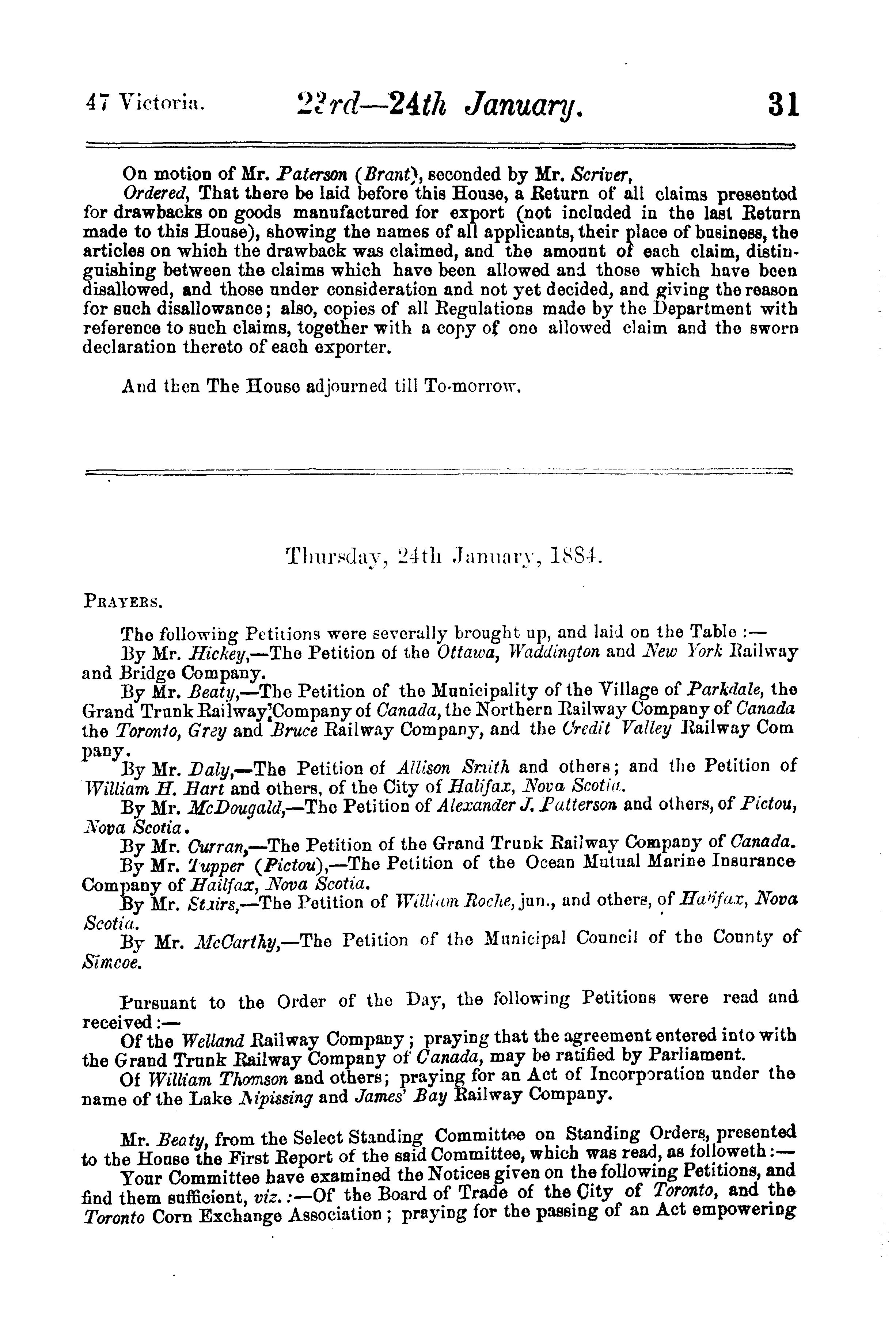 Journals of the House of Commons of the Dominion of Canada from the 17th of January to the 19th of April, 1884 ... being the 2nd session of the 5th Parliament of Canada, session 1884 : 1884