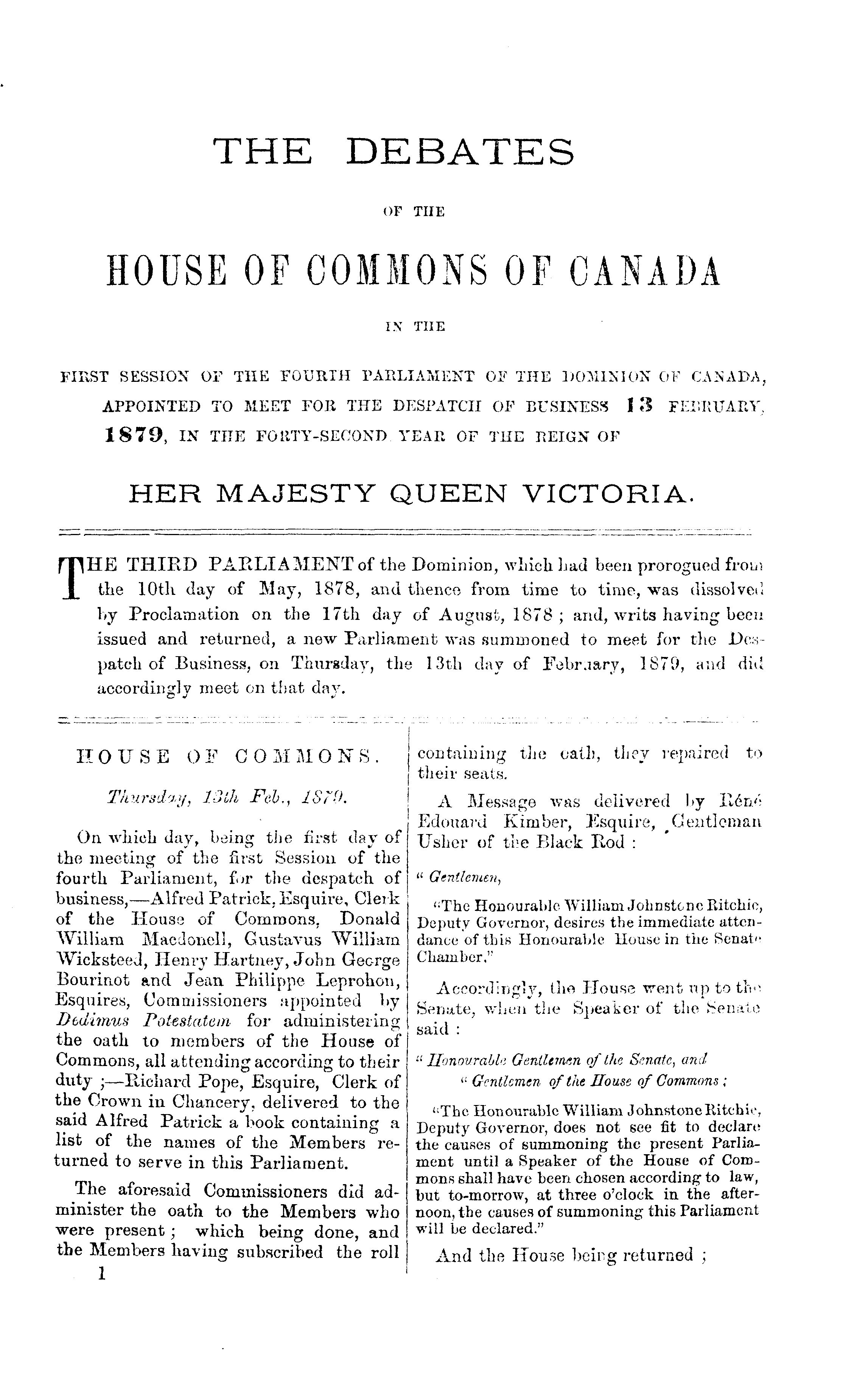Debates of the House of Commons of the Dominion of Canada : first session, fourth Parliament ... comprising the period from the thirteenth day of February, 1879 to the seventh day of April, 1879 : first volume of the session : 1879 (pt. 1)