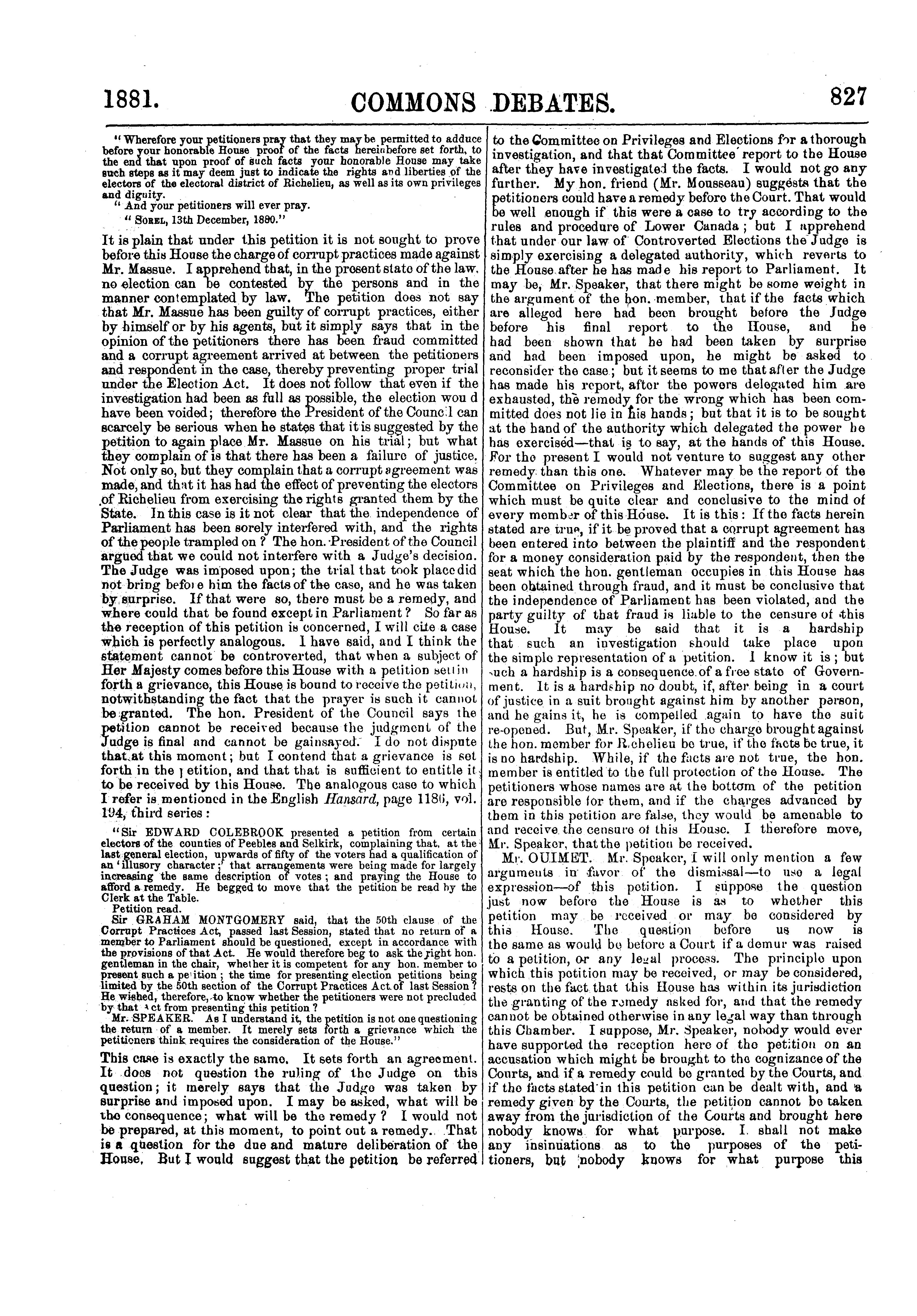 Debates of the House of Commons of the Dominion of Canada : third session, fourth Parliament ... comprising the period from the second day of February 1881, to the twenty-first day of March, 1881 : second volume of the session : 1881 (pt. 2)