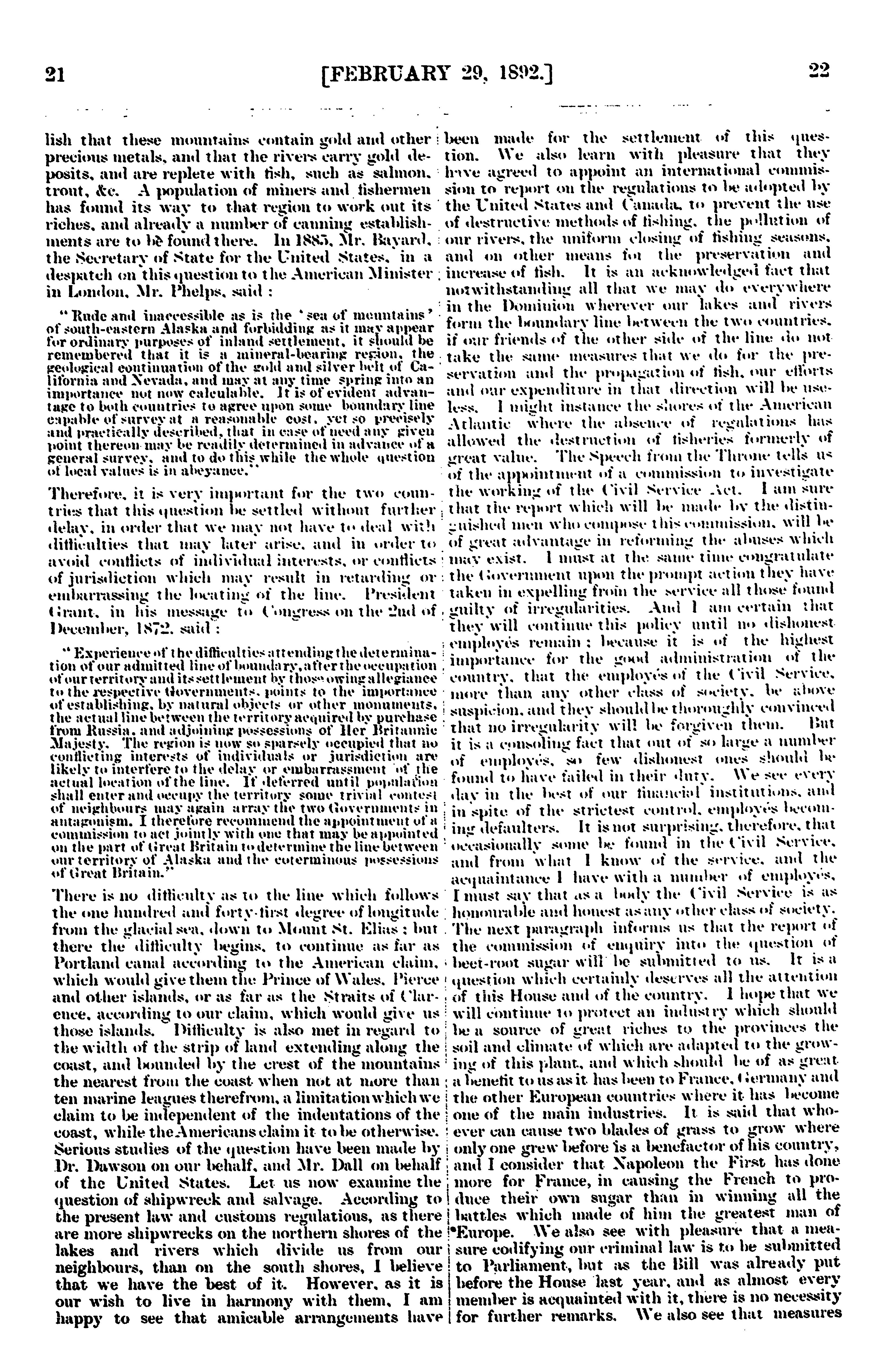 Official report of the debates of the House of Commons of the Dominion of Canada : second session, seventh Parliament ... comprising the period from the twenty-fifth day of February to the ninth day of May, inclusive : 1892 (pt. 1)