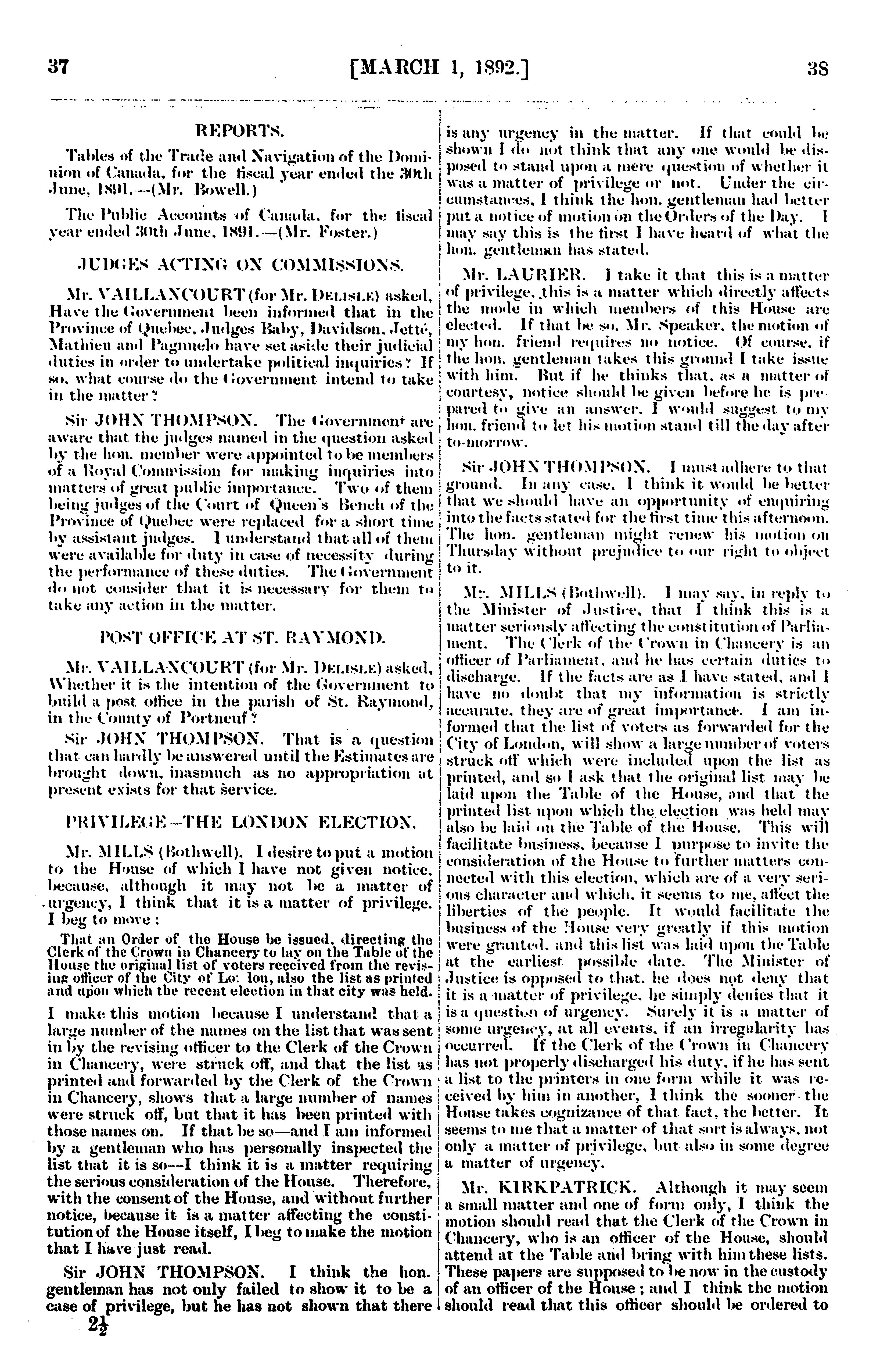Official report of the debates of the House of Commons of the Dominion of Canada : second session, seventh Parliament ... comprising the period from the twenty-fifth day of February to the ninth day of May, inclusive : 1892 (pt. 1)