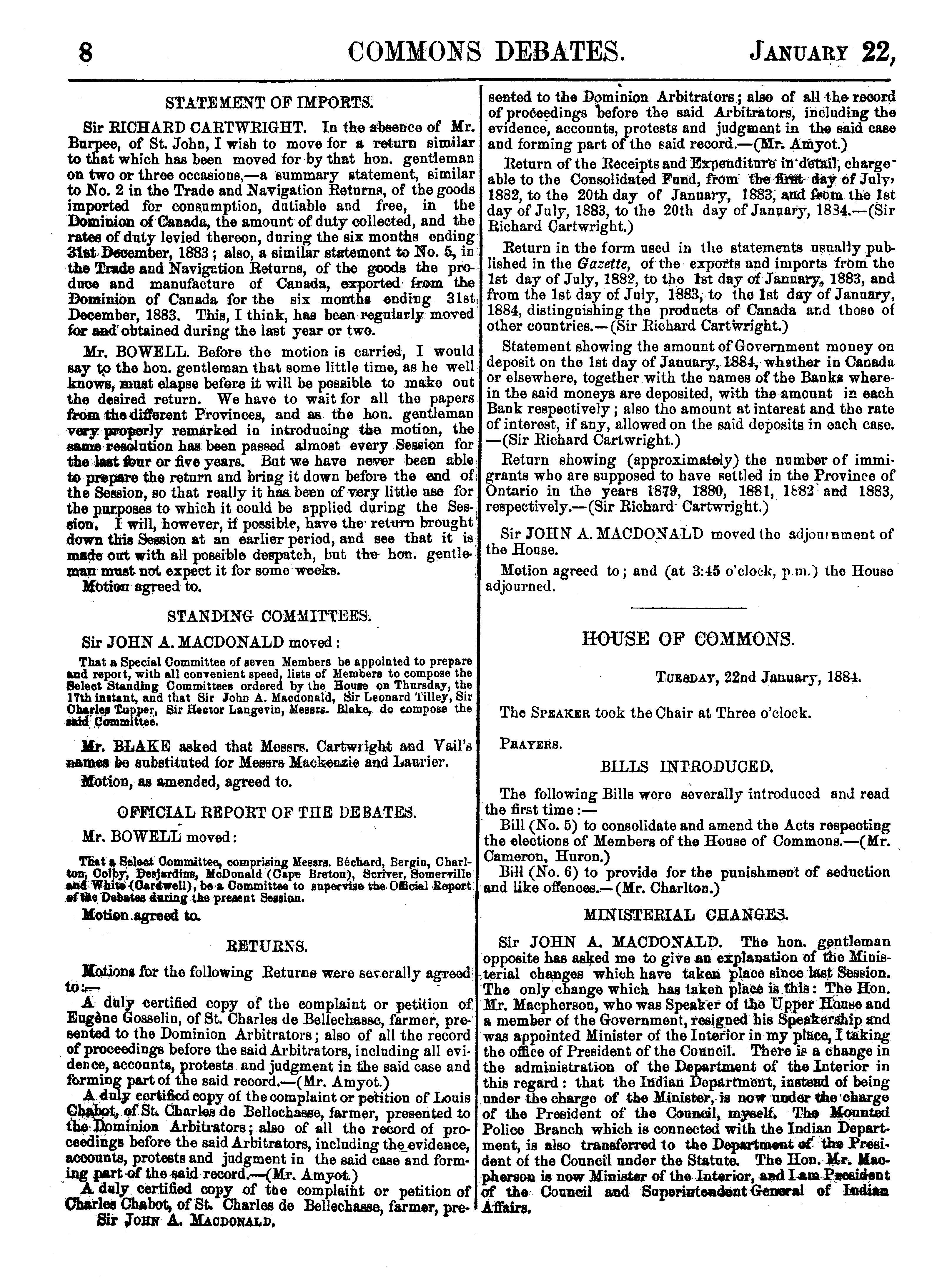 Official report of the debates of the House of Commons of the Dominion of Canada : second session, fifth Parliament ... comprising the period from the seventeenth day of January to the eleventh day of March, 1884 : 1884 (pt. 1)