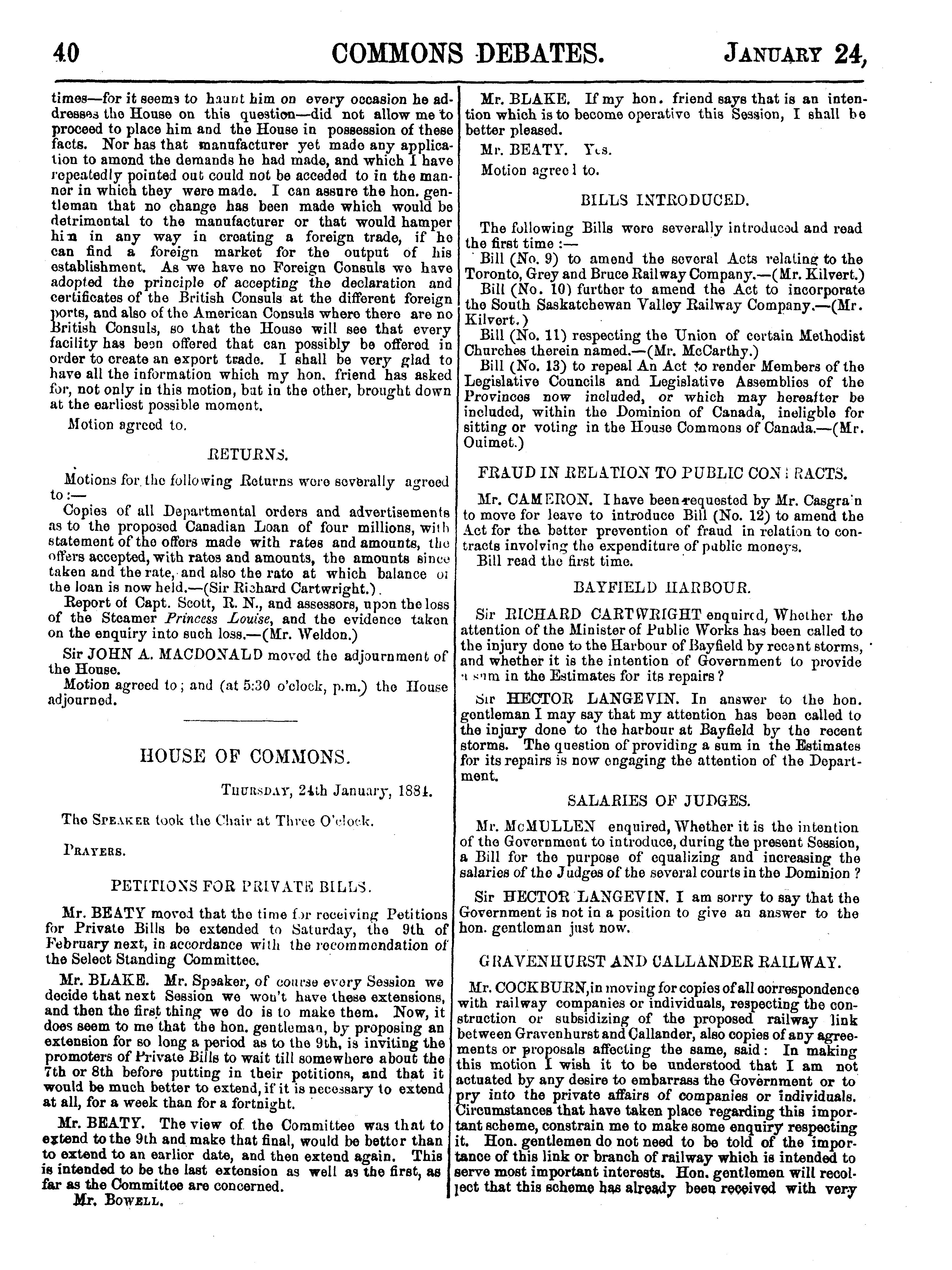 Official report of the debates of the House of Commons of the Dominion of Canada : second session, fifth Parliament ... comprising the period from the seventeenth day of January to the eleventh day of March, 1884 : 1884 (pt. 1)