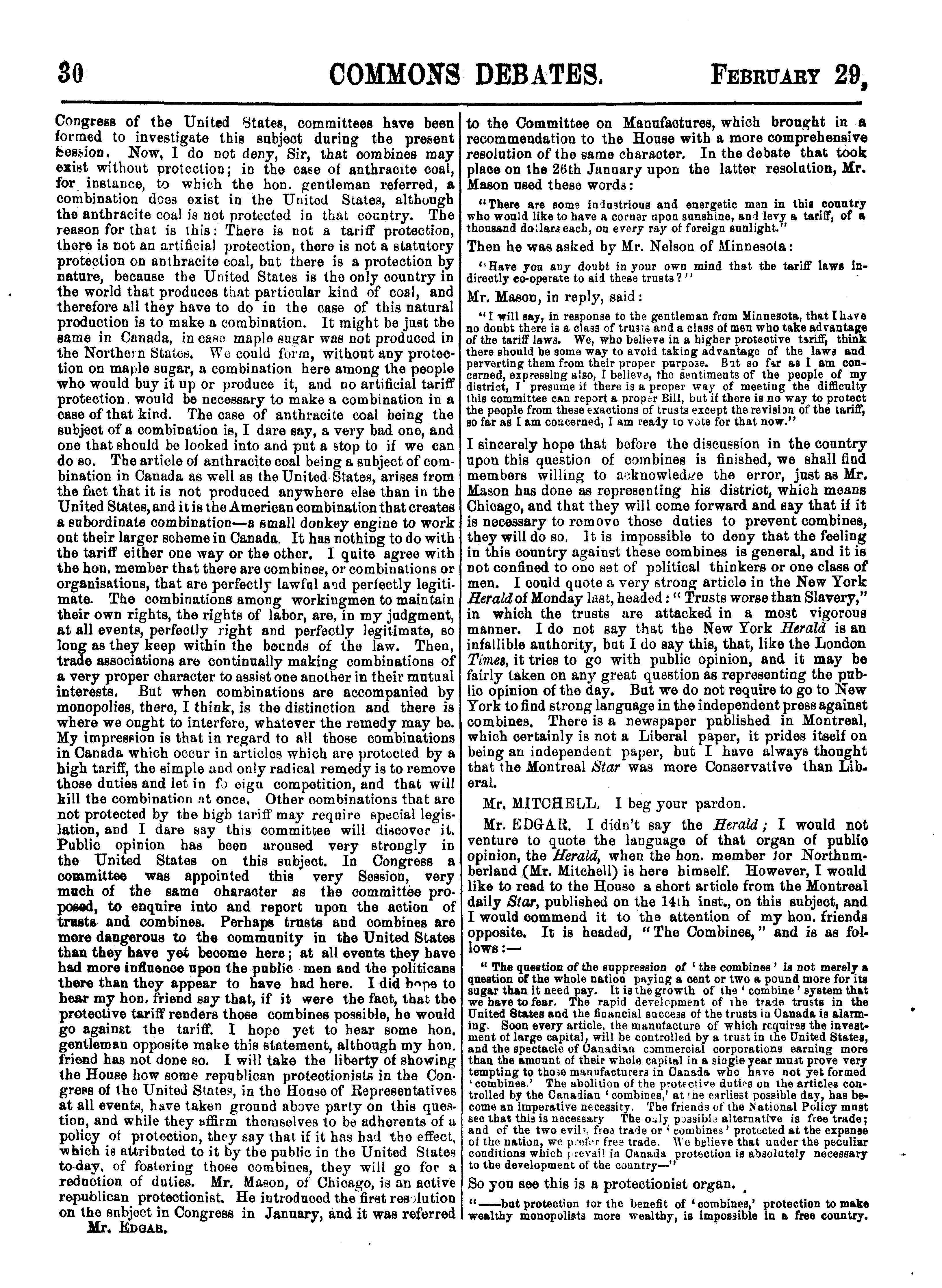 Official report of the debates of the House of Commons of the Dominion of Canada : Official report of the debates of the House of Commons of the Dominion of Canada : second session, sixth Parliament ... comprising the period from the twenty-third day of February to the thirteenth day of April, 1888 : 1888 (pt. 1)
