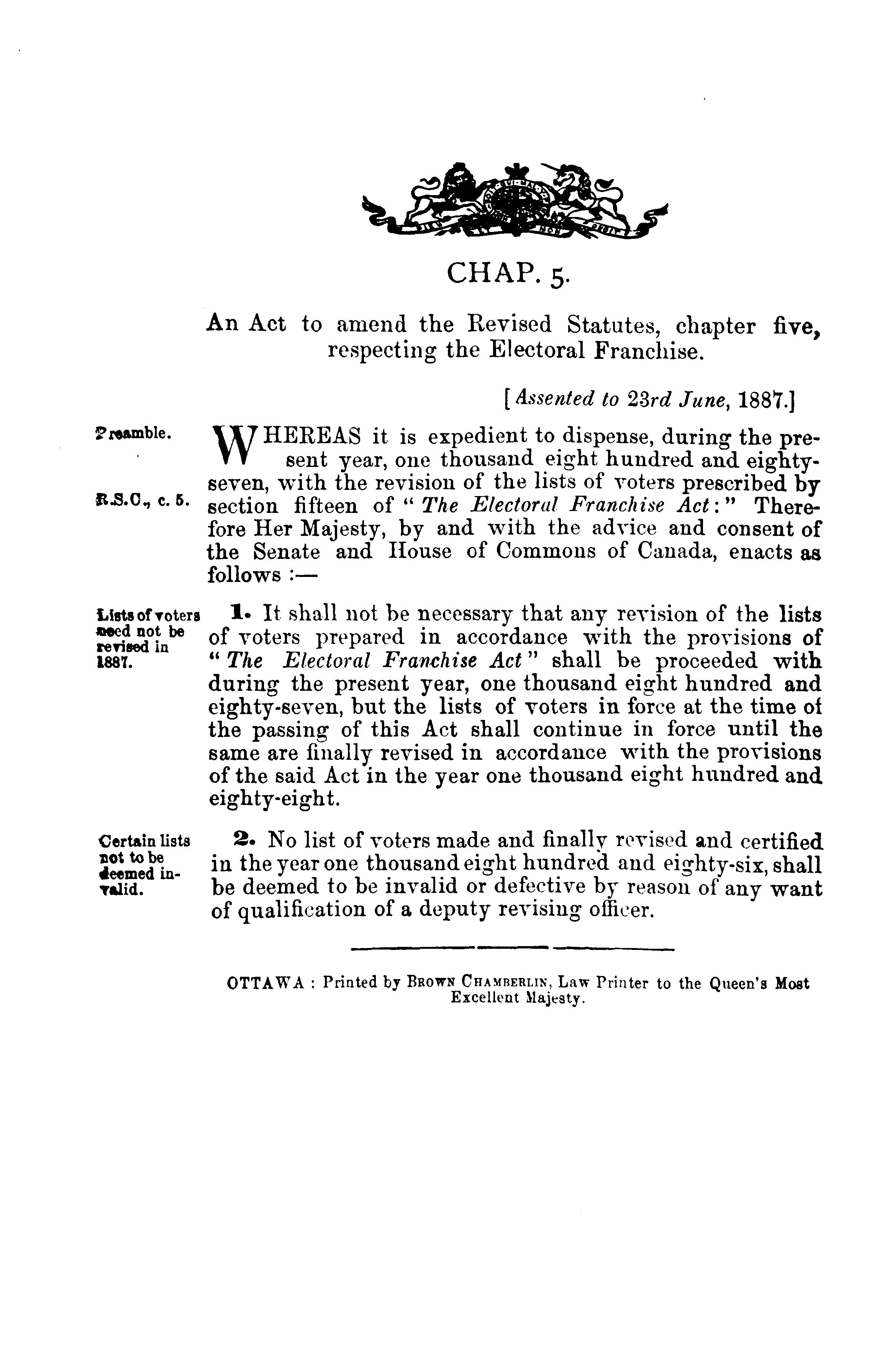 Acts of the Parliament of the Dominion of Canada ... first session of the sixth Parliament, begun and holden at Ottawa, on the thirteenth day of April, and closed by prorogation on the twenty-third day of June, 1887 : public general acts : 1887 (pt. 1) (Acts 1-52)