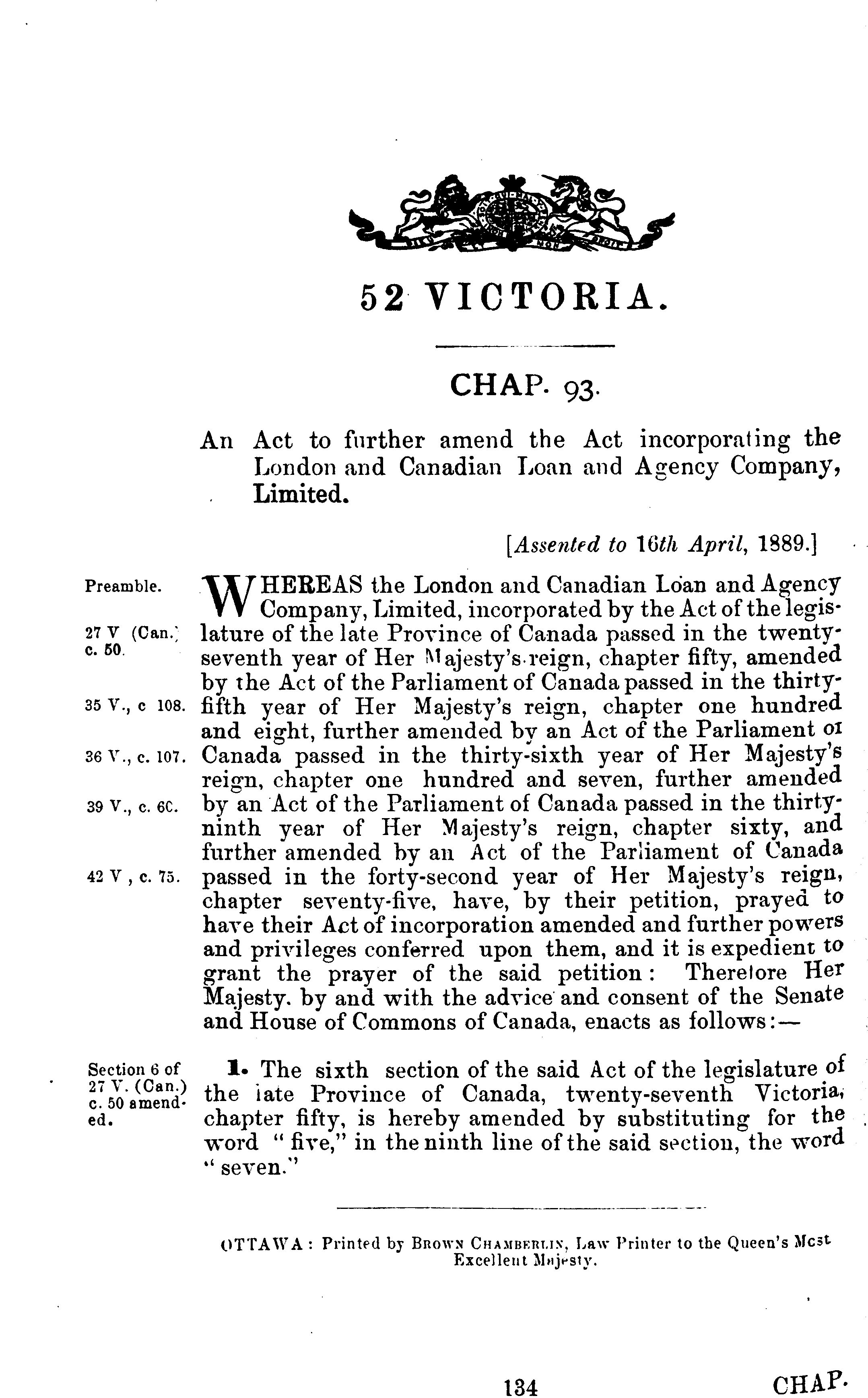 Acts of the Parliament of the Dominion of Canada ... third session of the sixth Parliament, begun and holden at Ottawa, on the thirty-first day of January, and closed by prorogation on the second day of May, 1889 : local and private acts : 1889 (pt. 2) (Acts 48-110)