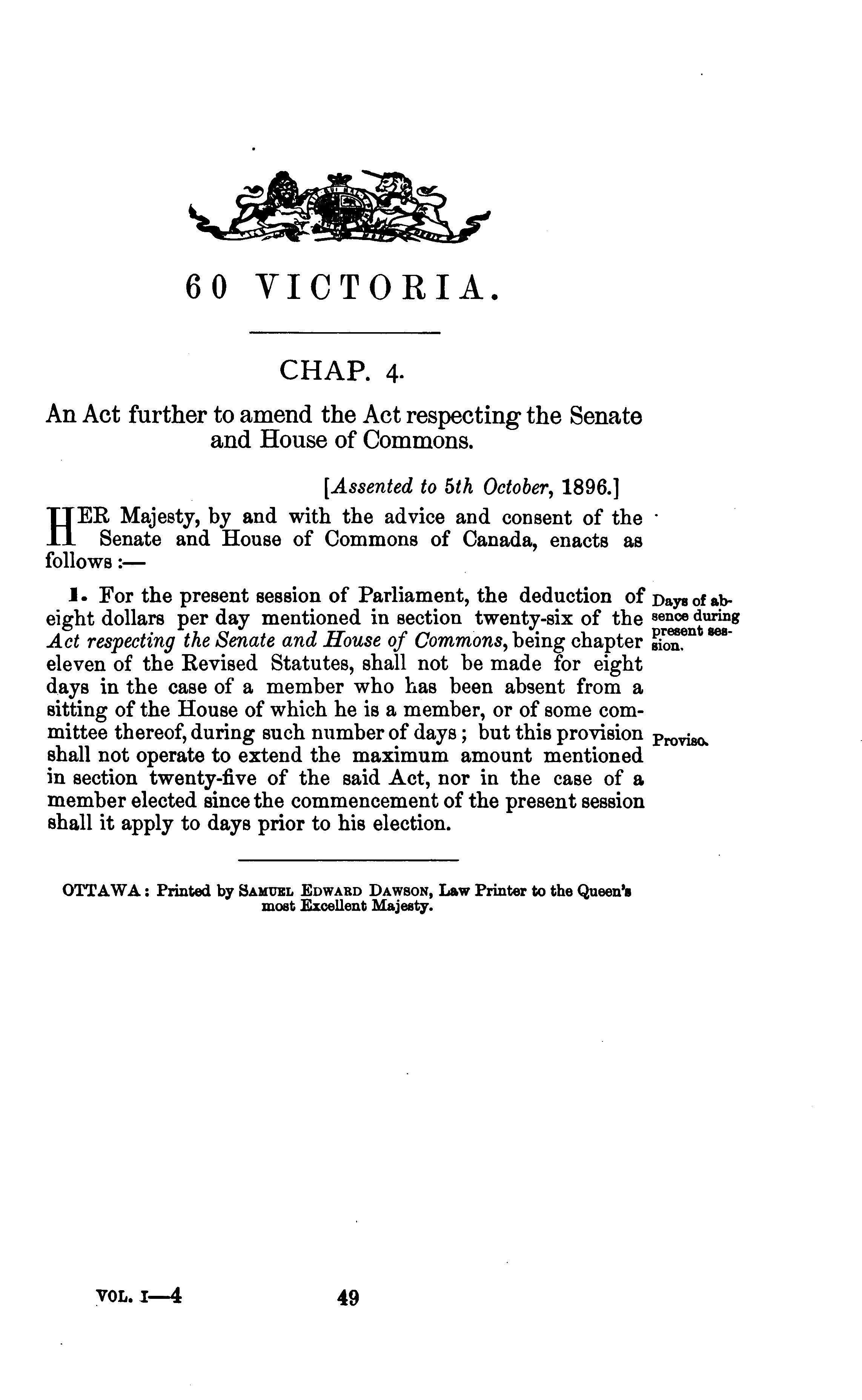 - Acts of the Parliament of the Dominion of Canada ... first session of the eighth Parliament, begun and holden at Ottawa, on the nineteenth day of August, and closed by prorogation on the fifth day of October, 1896 : public general acts : 1896 (pt. 1) (Acts 1-5)