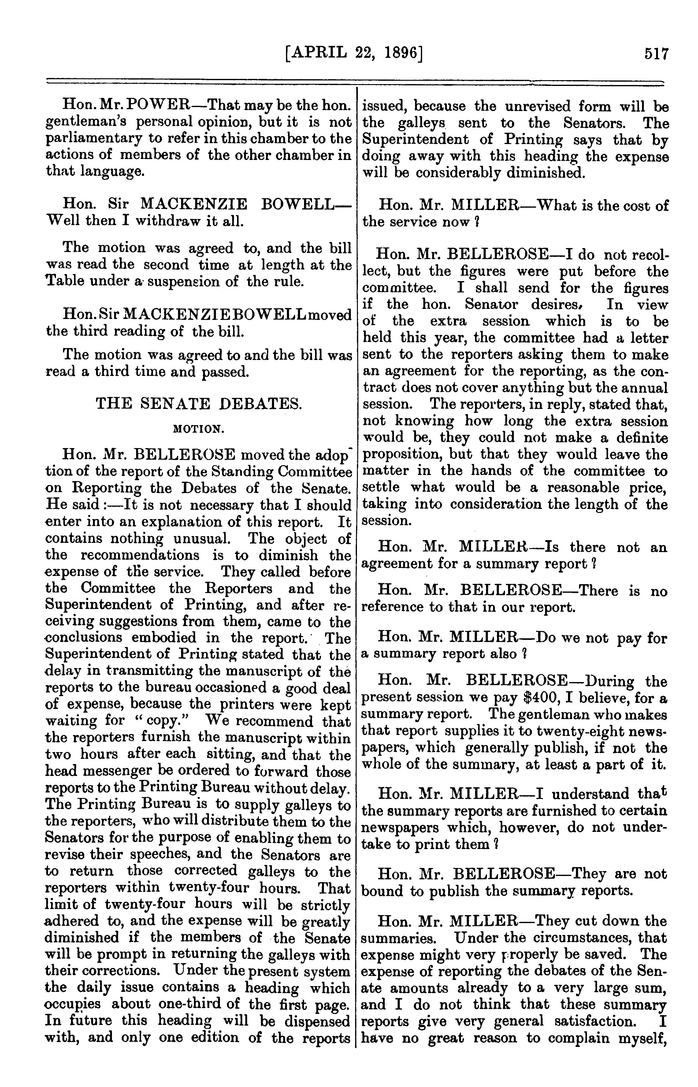 Debates of the Senate of the Dominion of Canada, 1896 : sixth session, seventh Parliament : 1896