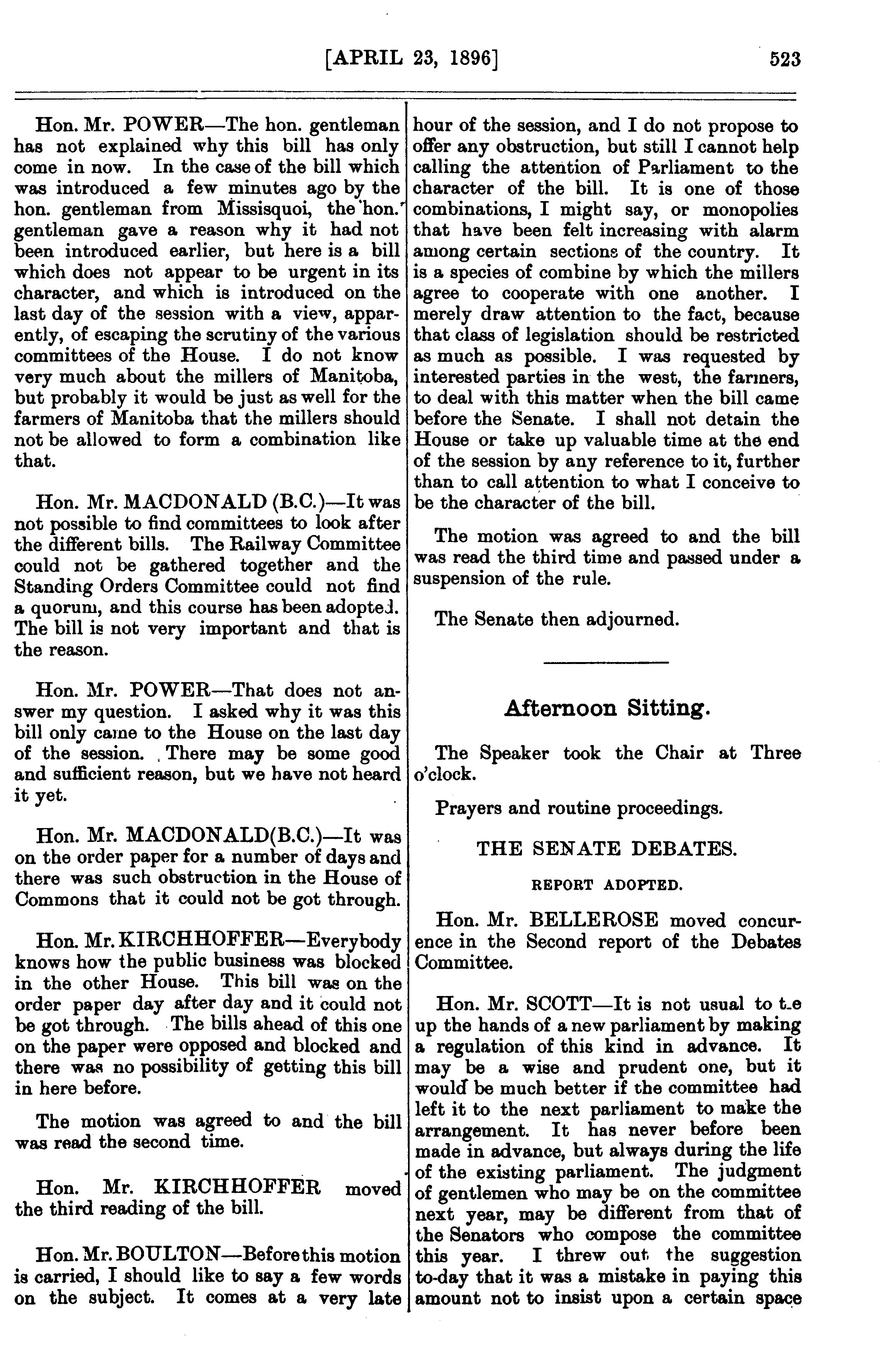 Debates and proceedings of the Senate of Canada : Debates of the Senate of the Dominion of Canada, 1896 : sixth session, seventh Parliament : 1896