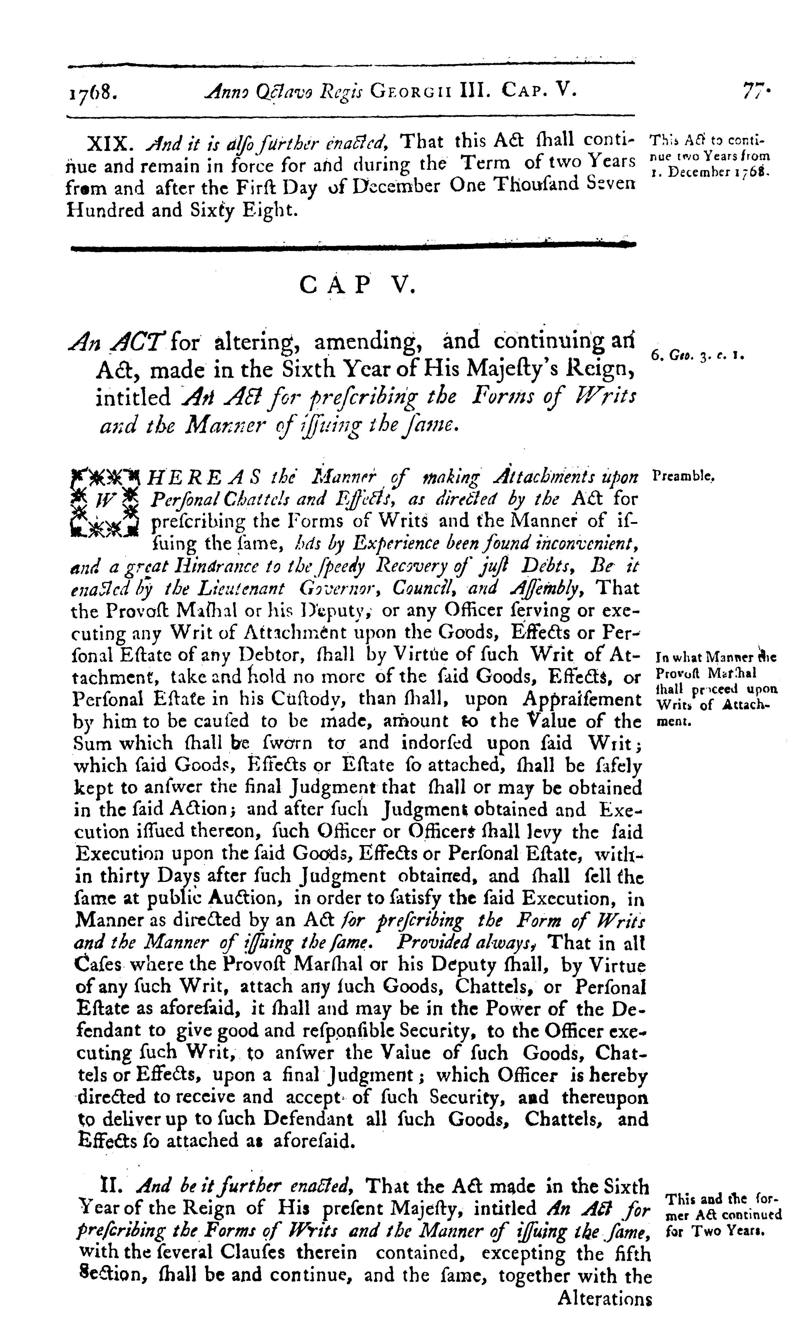 - [The temporary acts of the general assemblies of His Majesty's province of Nova Scotia : being the seventh session of the fourth General Assembly convened in the said province] : Temporary - 1768/69 (Acts 1-9) (p. 71-96)