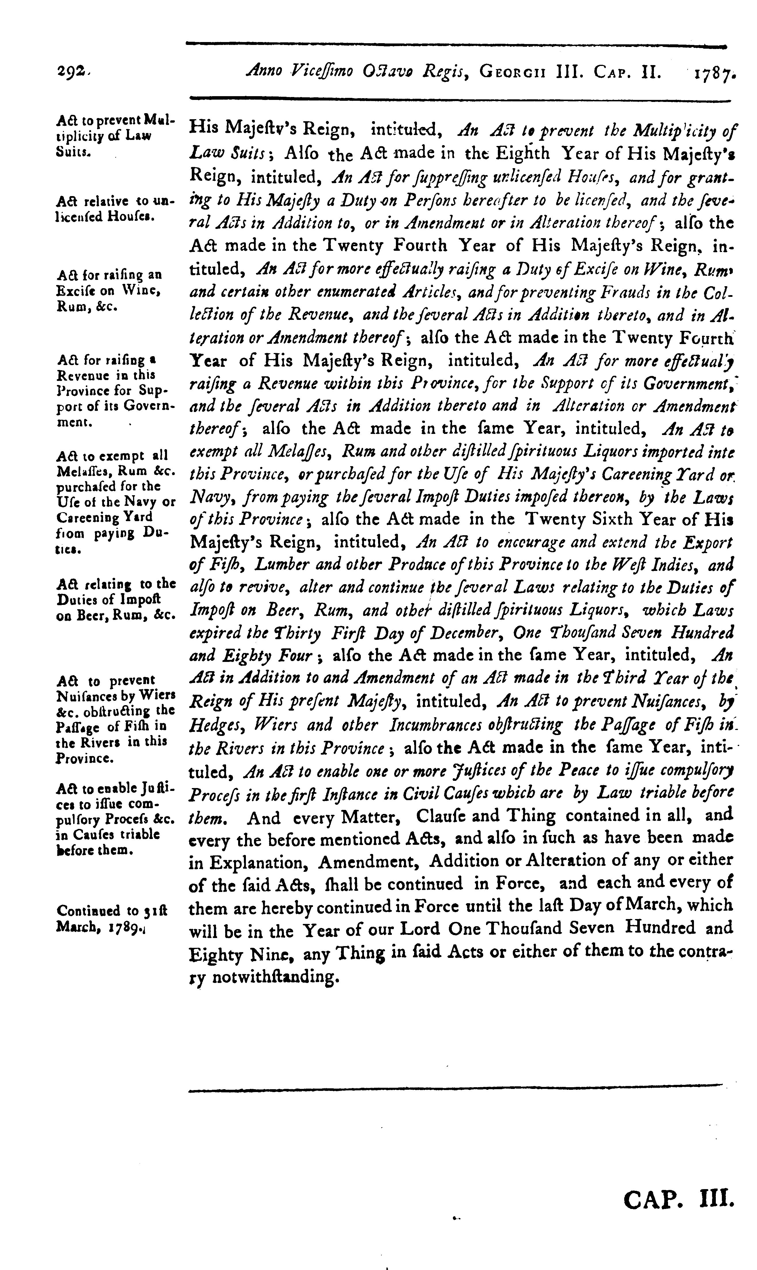 - [The temporary acts of the general assemblies of His Majesty's province of Nova Scotia : being the third session of the sixth General Assembly convened in the said province] : Temporary - 1787 (Acts 1-4) (p. 287-305)