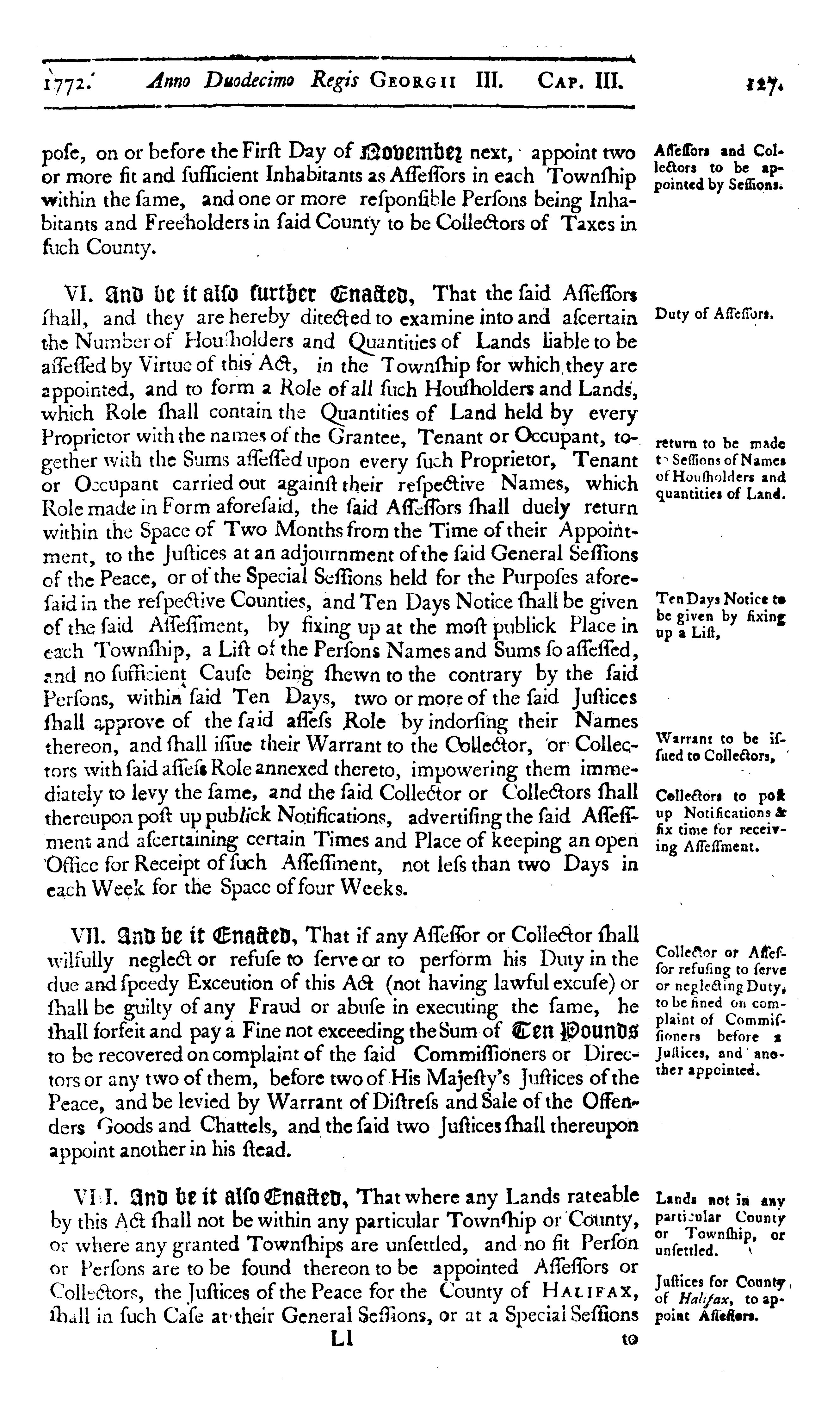 - [The temporary acts of the general assemblies of His Majesty's province of Nova Scotia : being the third session of the fifth General Assembly convened in the said province] : Temporary - 1772 (Acts 1-3) (p. 123-131)