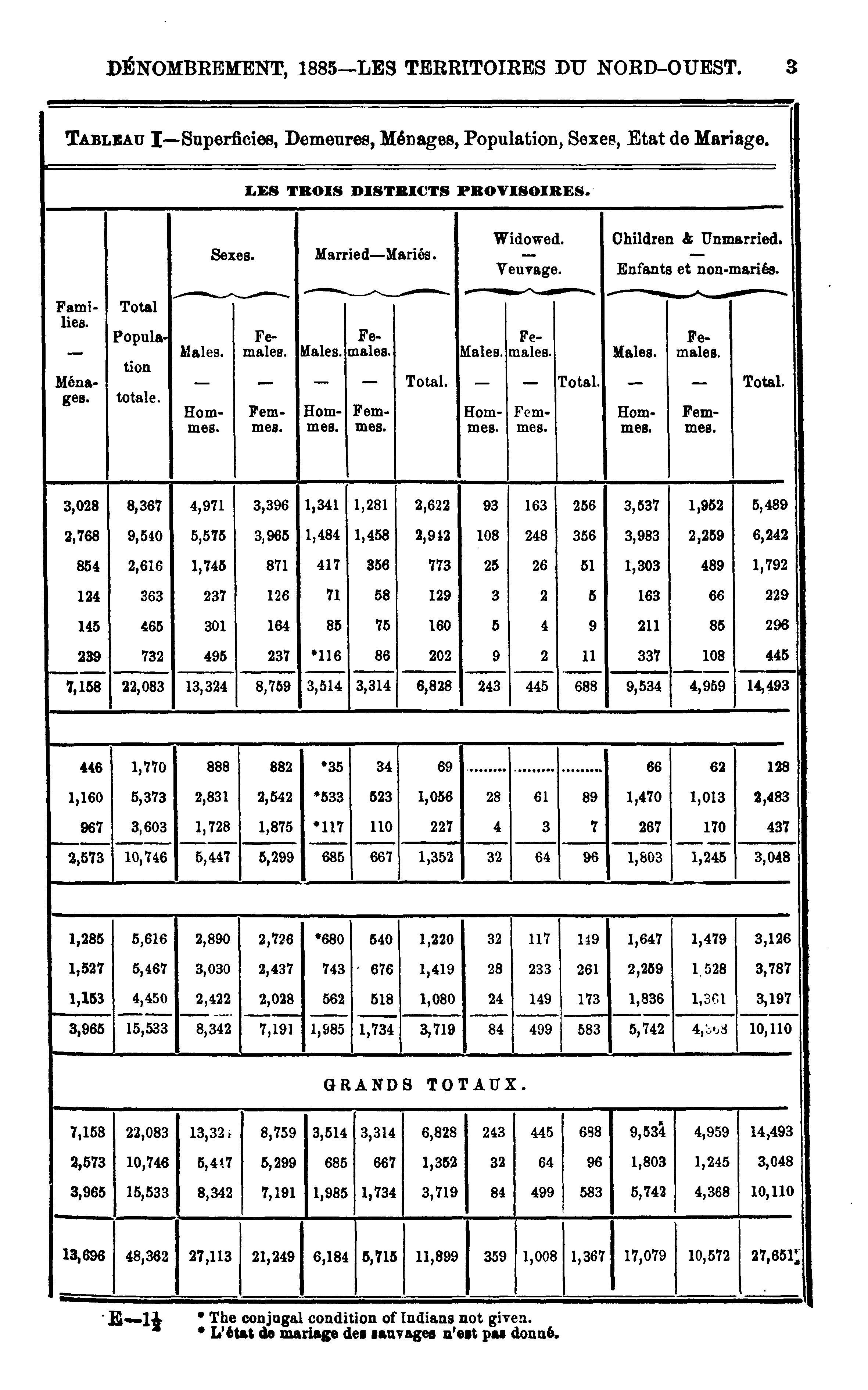 Census of the three provisional districts of the North-West Territories, 1884-5 = Recensement des trois districts provisoires des Territoires du Nord-Ouest, 1884-5. - Adresse bibliographique