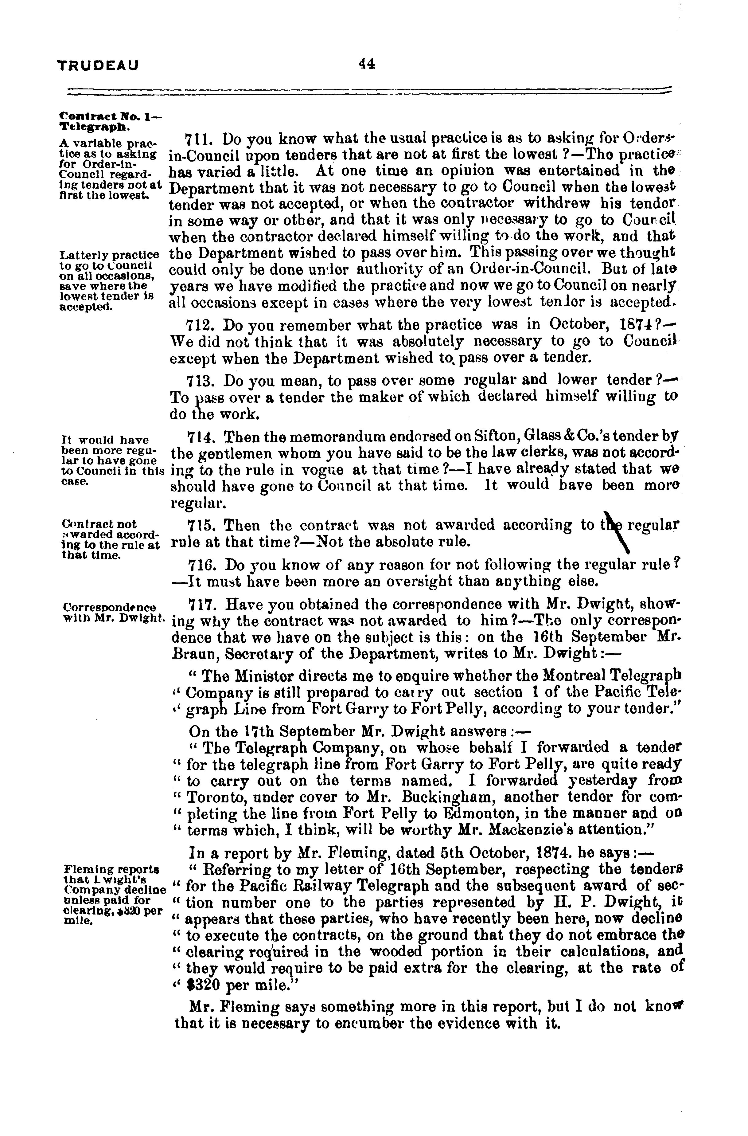 The commission was appointed "to make enquiry into and concerning all facts connected with, and the conduct and prosecution of, the Canadian Pacific Railway from its inception ..."--p. 29. The report has information on surveys, location of the route, and on contracts. The introduction of 25 pages by N. Flood Davin gives a valuable review of events connected with overland communication to the Pacific.