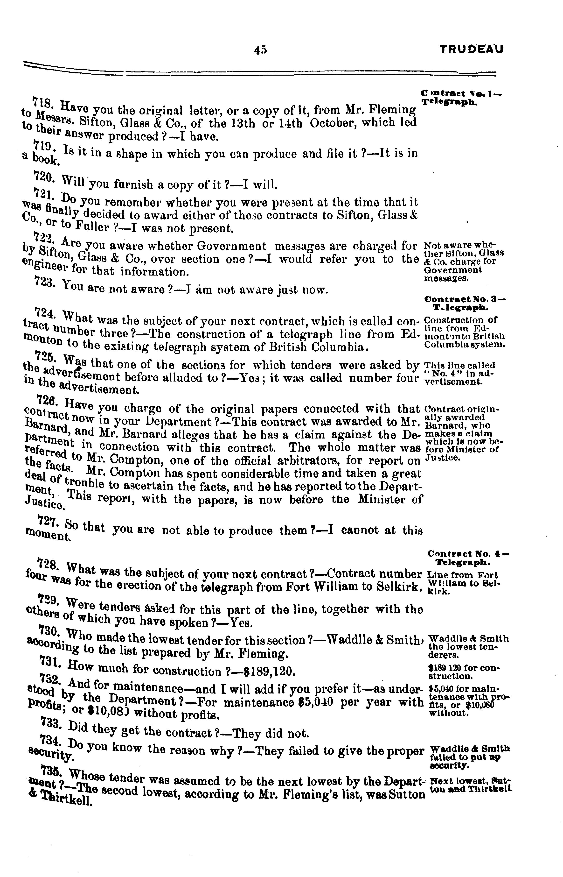 The commission was appointed "to make enquiry into and concerning all facts connected with, and the conduct and prosecution of, the Canadian Pacific Railway from its inception ..."--p. 29. The report has information on surveys, location of the route, and on contracts. The introduction of 25 pages by N. Flood Davin gives a valuable review of events connected with overland communication to the Pacific.
