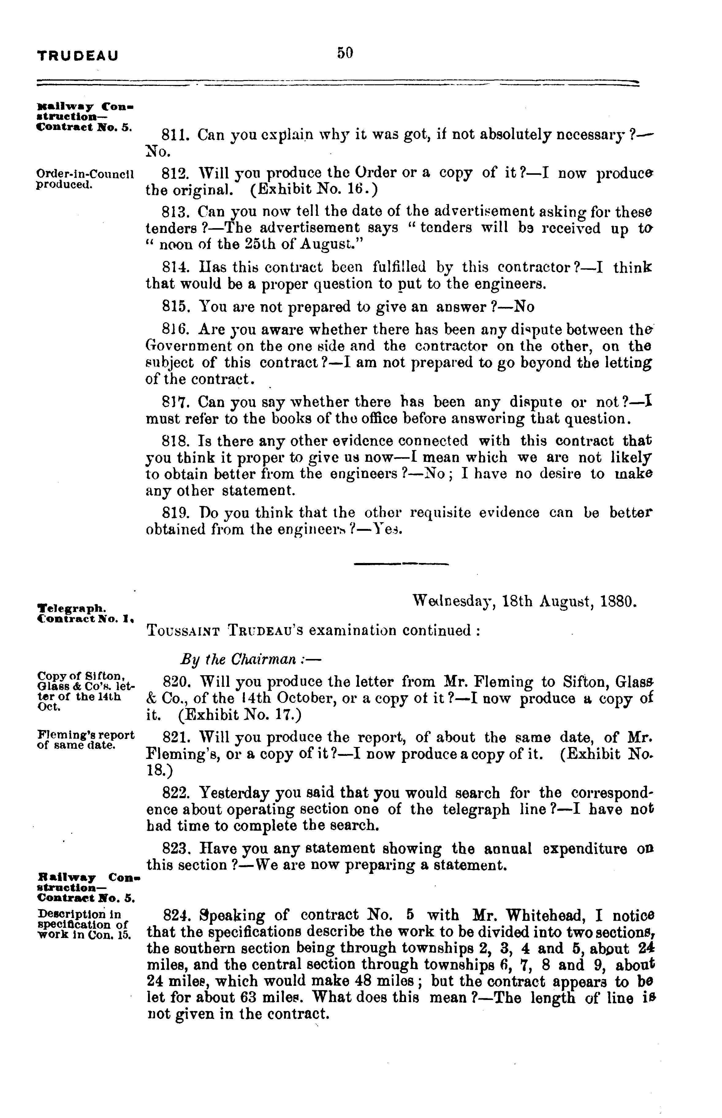 The commission was appointed "to make enquiry into and concerning all facts connected with, and the conduct and prosecution of, the Canadian Pacific Railway from its inception ..."--p. 29. The report has information on surveys, location of the route, and on contracts. The introduction of 25 pages by N. Flood Davin gives a valuable review of events connected with overland communication to the Pacific.