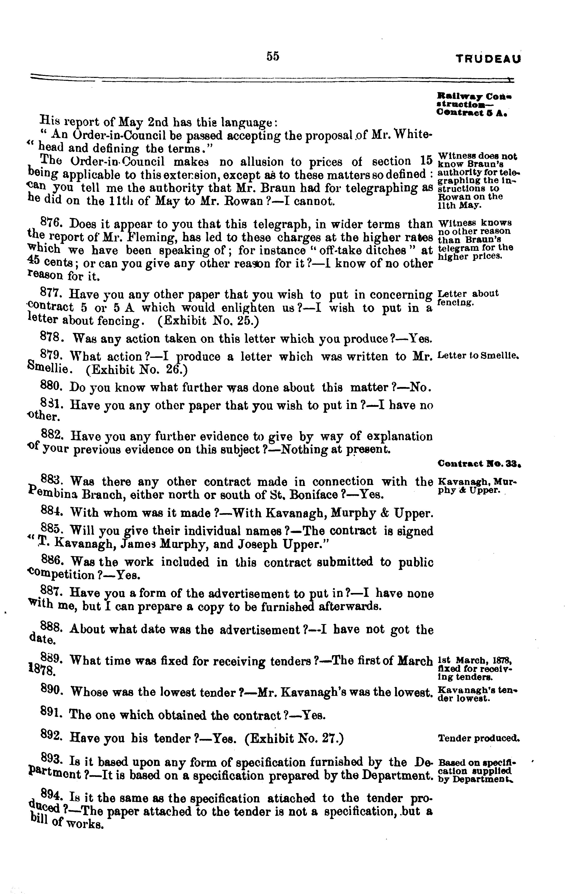 The commission was appointed "to make enquiry into and concerning all facts connected with, and the conduct and prosecution of, the Canadian Pacific Railway from its inception ..."--p. 29. The report has information on surveys, location of the route, and on contracts. The introduction of 25 pages by N. Flood Davin gives a valuable review of events connected with overland communication to the Pacific.