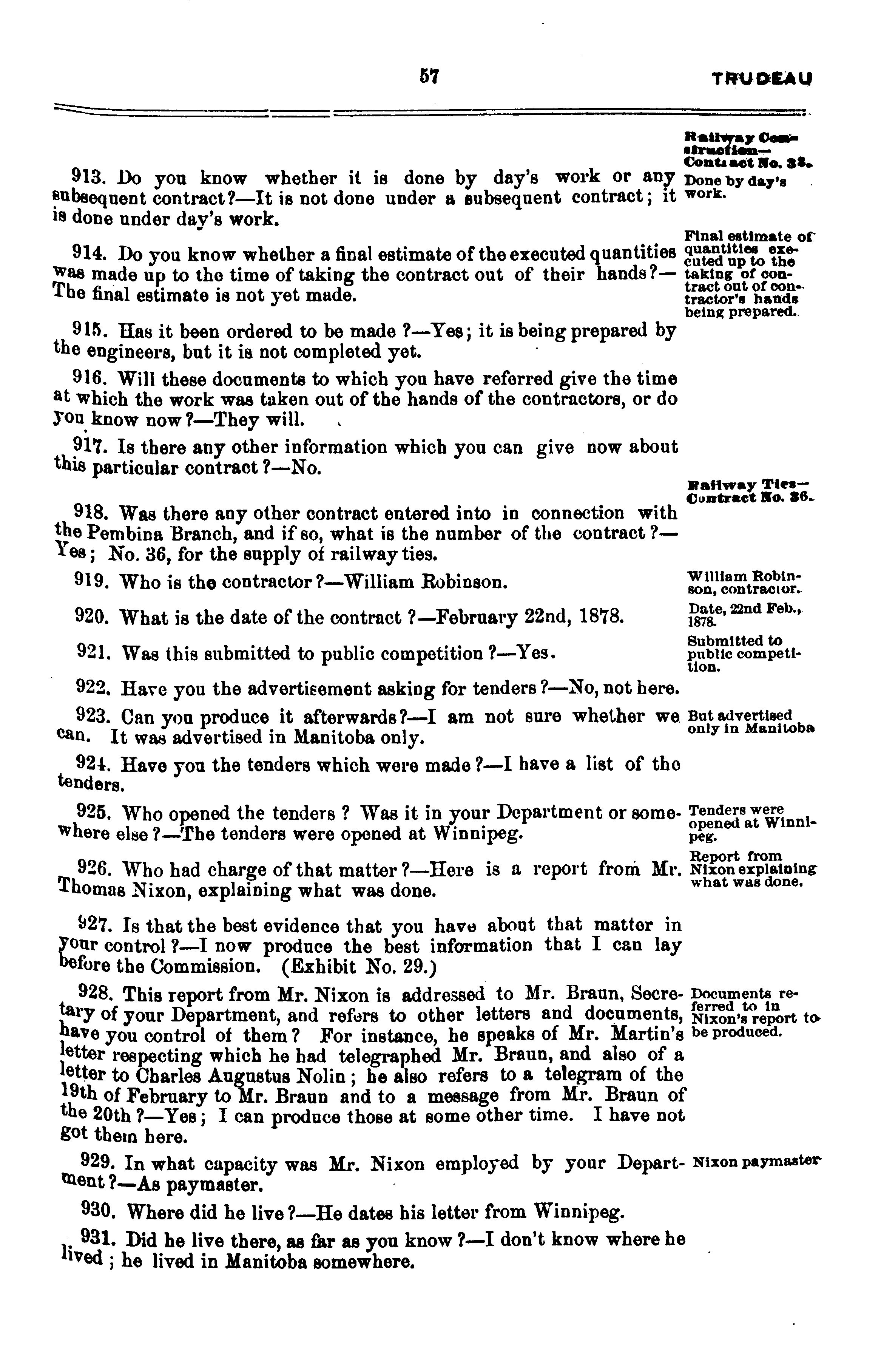 The commission was appointed "to make enquiry into and concerning all facts connected with, and the conduct and prosecution of, the Canadian Pacific Railway from its inception ..."--p. 29. The report has information on surveys, location of the route, and on contracts. The introduction of 25 pages by N. Flood Davin gives a valuable review of events connected with overland communication to the Pacific.