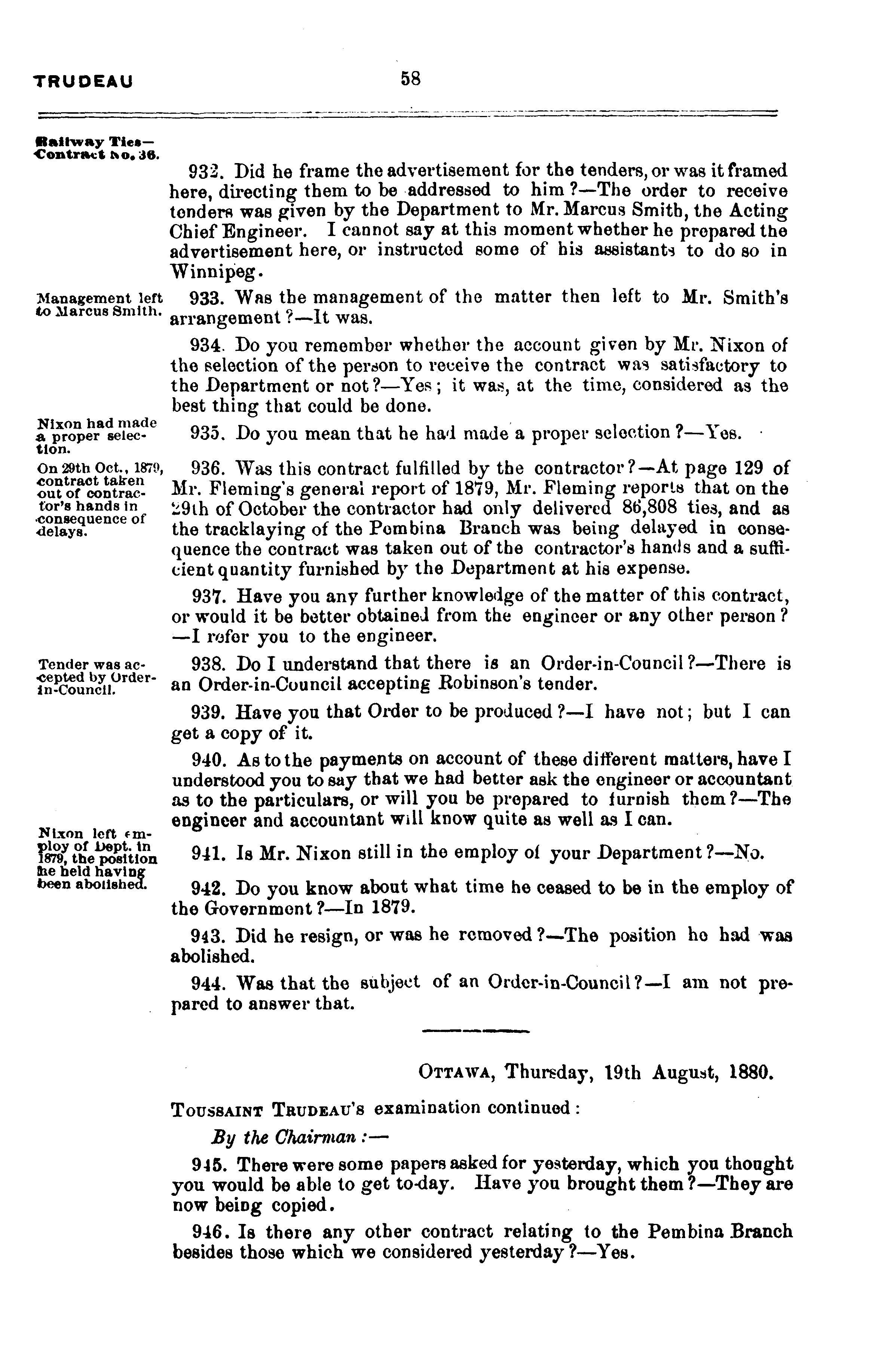 The commission was appointed "to make enquiry into and concerning all facts connected with, and the conduct and prosecution of, the Canadian Pacific Railway from its inception ..."--p. 29. The report has information on surveys, location of the route, and on contracts. The introduction of 25 pages by N. Flood Davin gives a valuable review of events connected with overland communication to the Pacific.