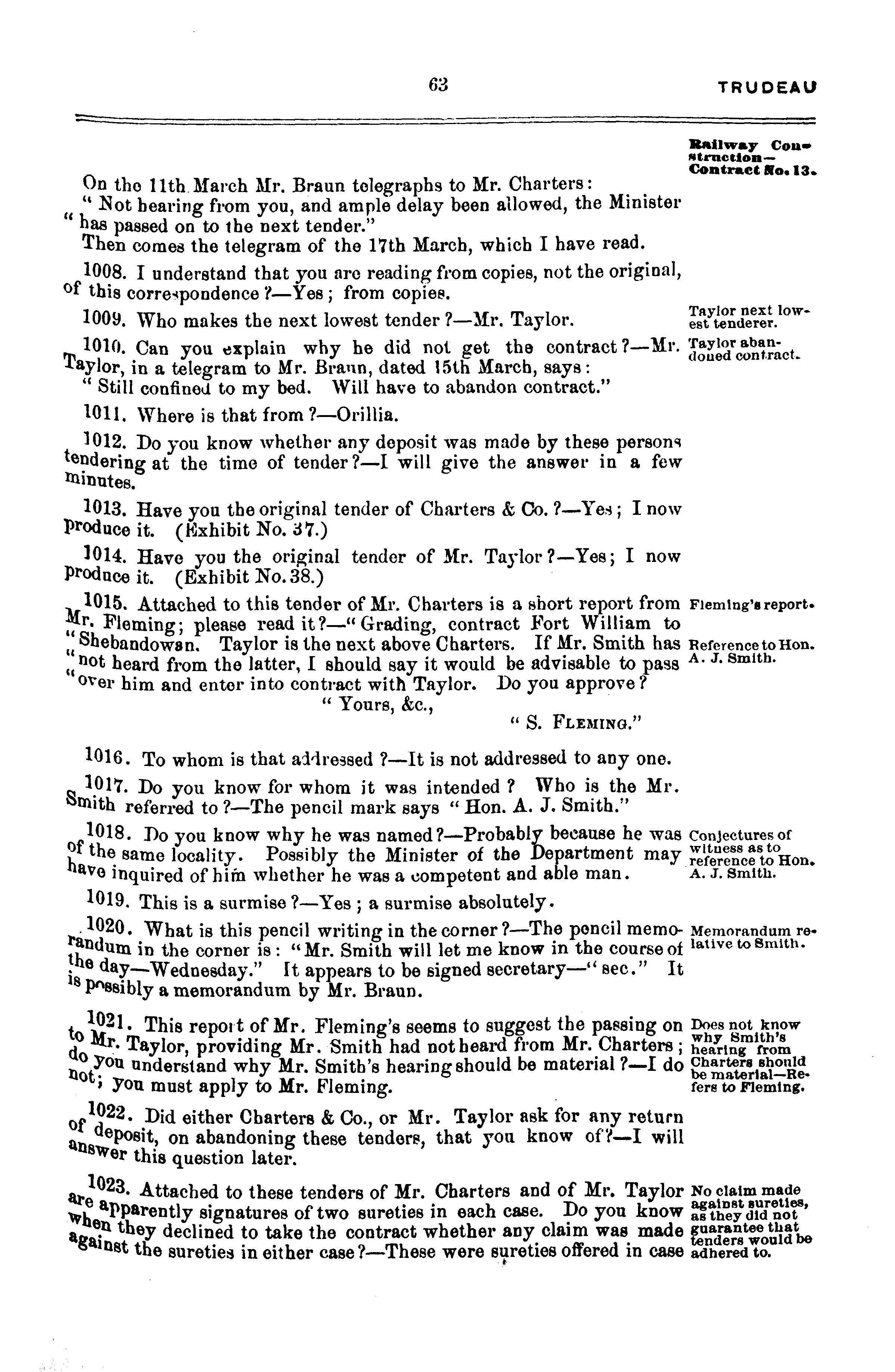 The commission was appointed "to make enquiry into and concerning all facts connected with, and the conduct and prosecution of, the Canadian Pacific Railway from its inception ..."--p. 29. The report has information on surveys, location of the route, and on contracts. The introduction of 25 pages by N. Flood Davin gives a valuable review of events connected with overland communication to the Pacific.