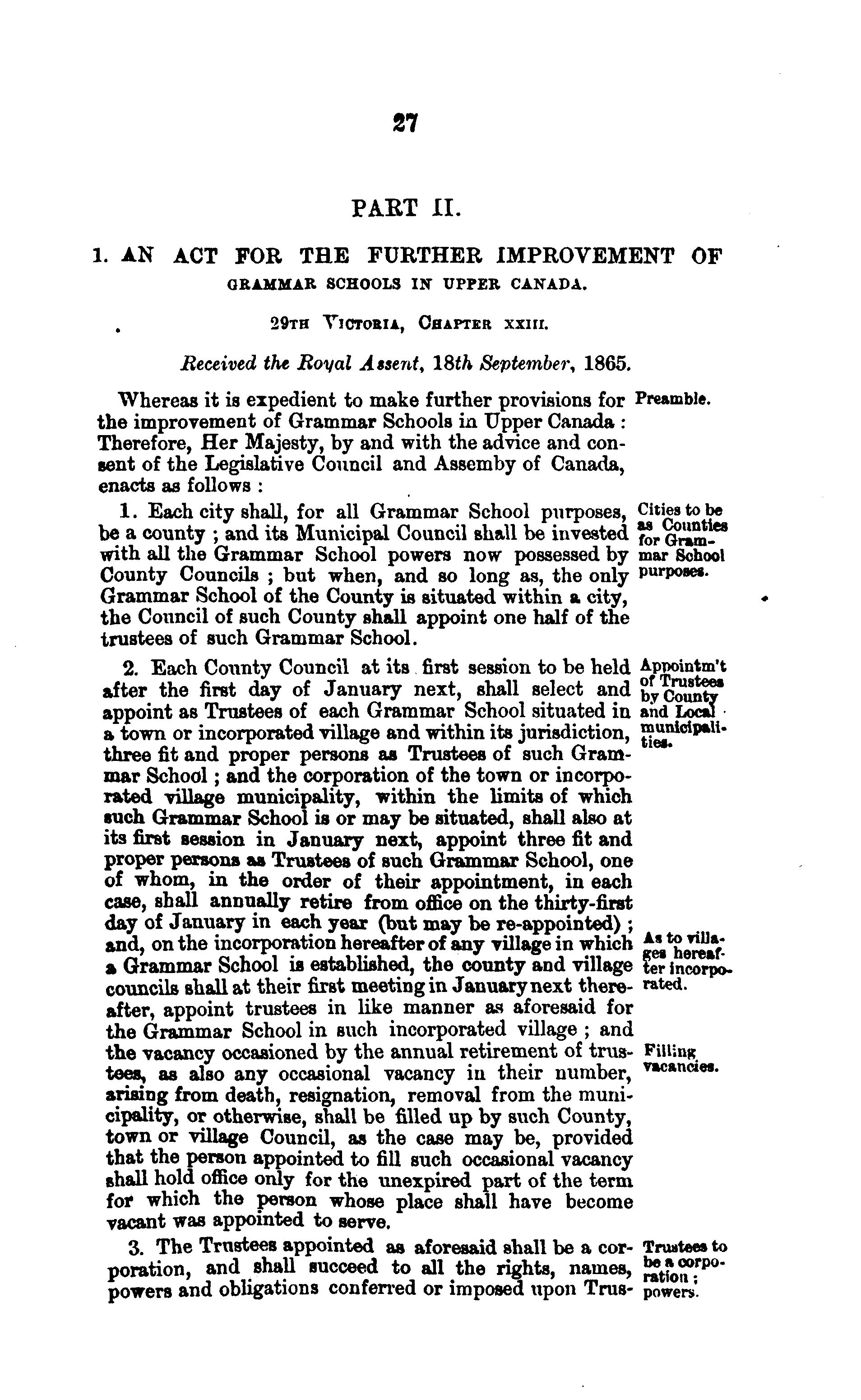 Grammar school manual : the consolidated acts relating to grammar schools in Upper Canada, together with the revised programme of studies, and the general regulations and instructions for grammar schools, with a copious analytical index