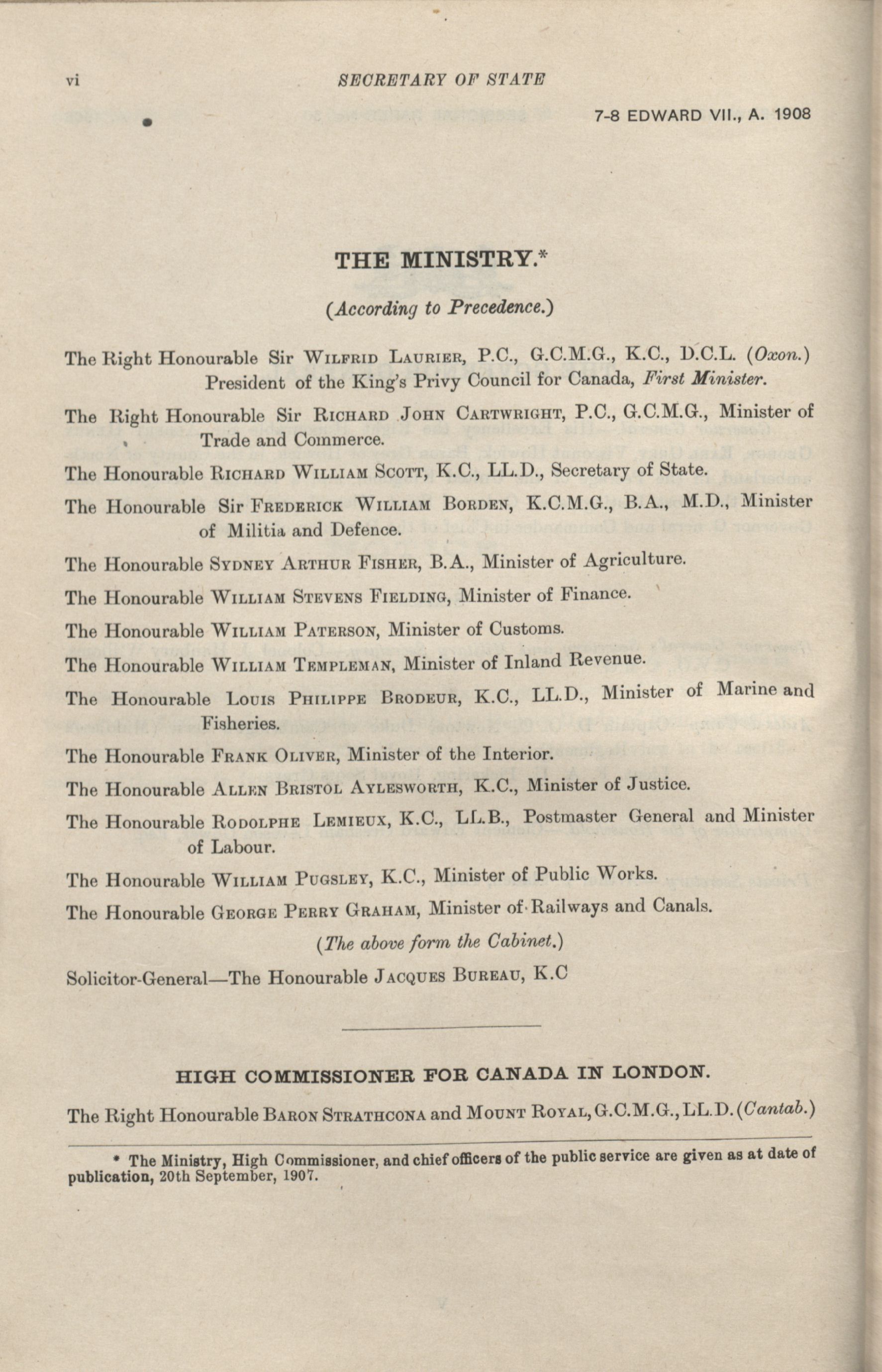 The civil service list of Canada, 1907 : containing the names of all persons employed in the several departments of the civil service, together with those employed in the two Houses of Parliament, on the 1st April, 1907 ... to which are added 'The Civil Service Act' ... 'The Civil Service Superannuation and Retirement Act' ... and 'The Civil Service Insurance Act' ...