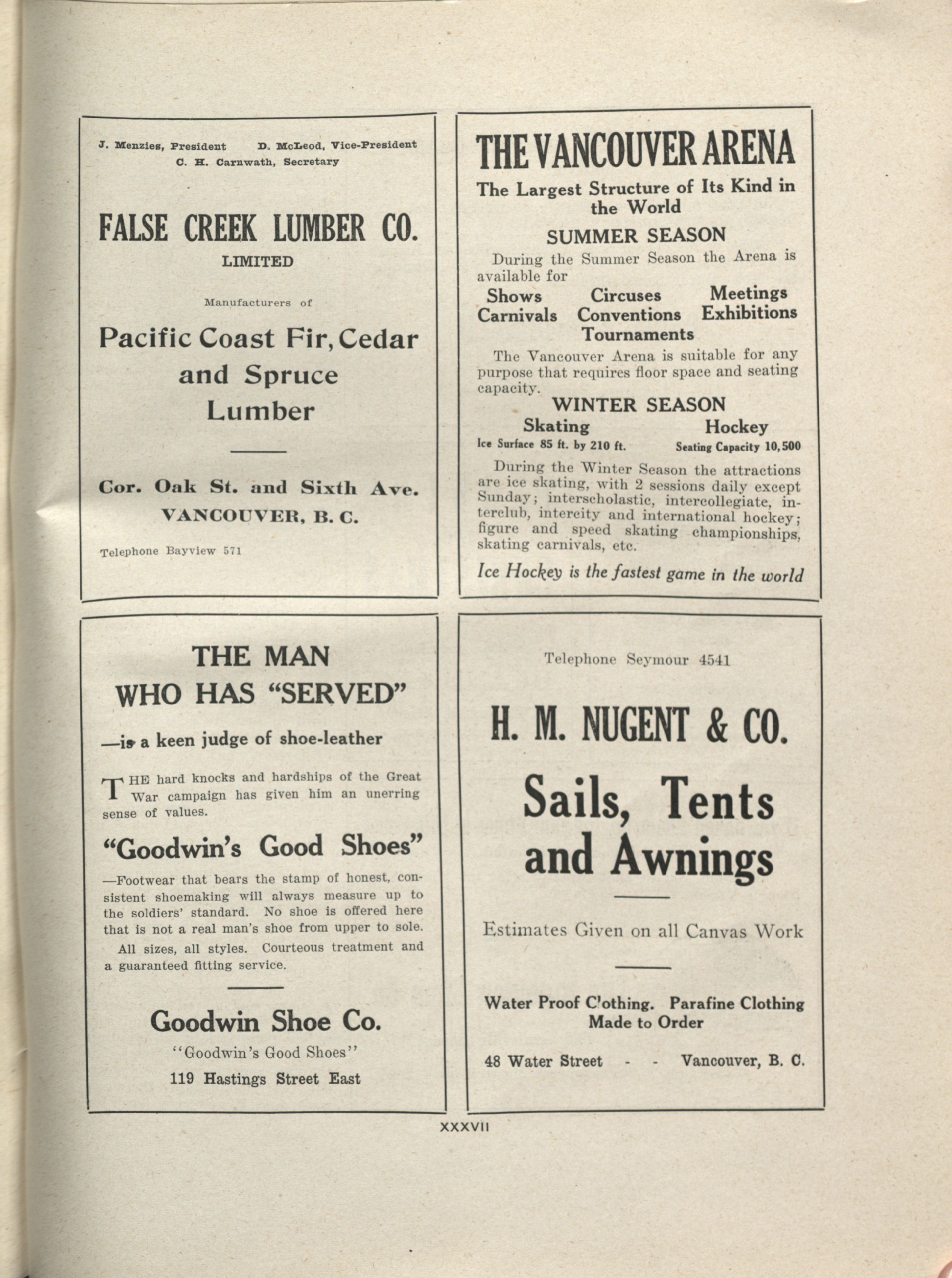 "The Net Profits of this Publication will go to the Amputation Club of B.C., Vancouver for men who have been maimed and wounded in the Great War."