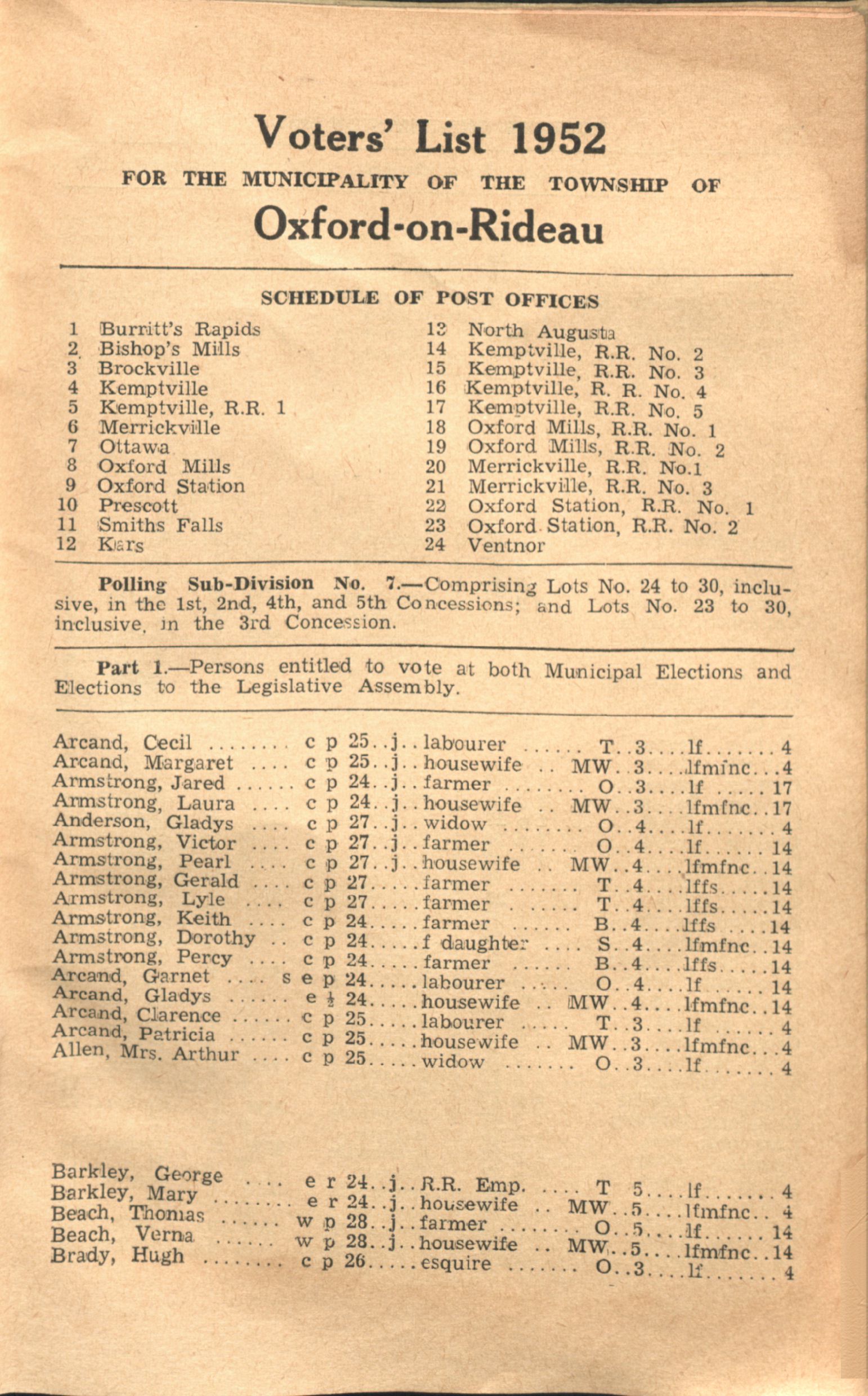 Voters' list for the municipality of the township of Oxford-on-Rideau for the year 1952