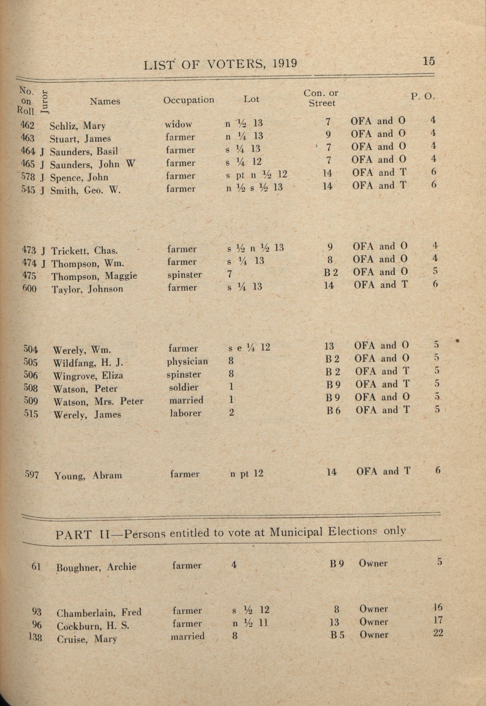 Caption title: List of voters for the year 1919 of the township of North Walsingham.