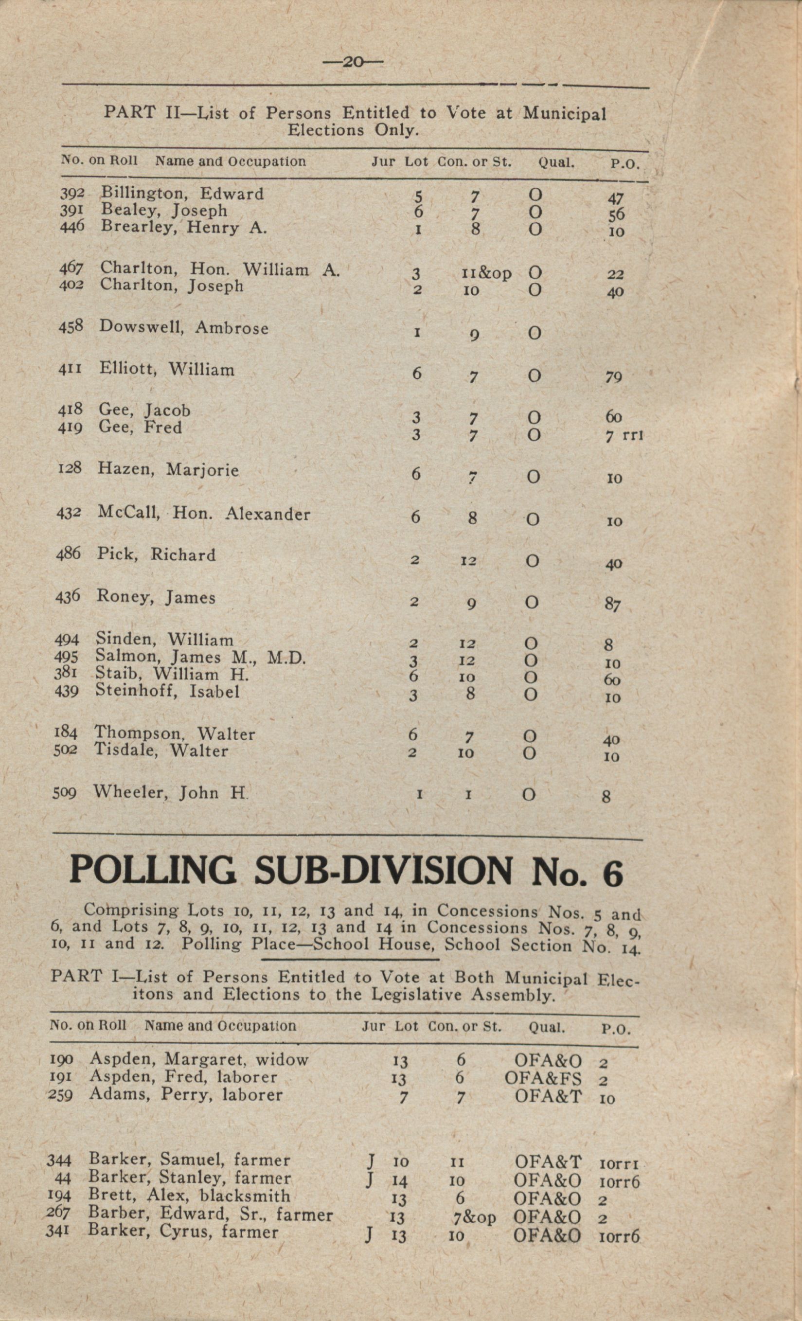 Caption title: Voters' list for the township of Charlotteville for the year 1919.