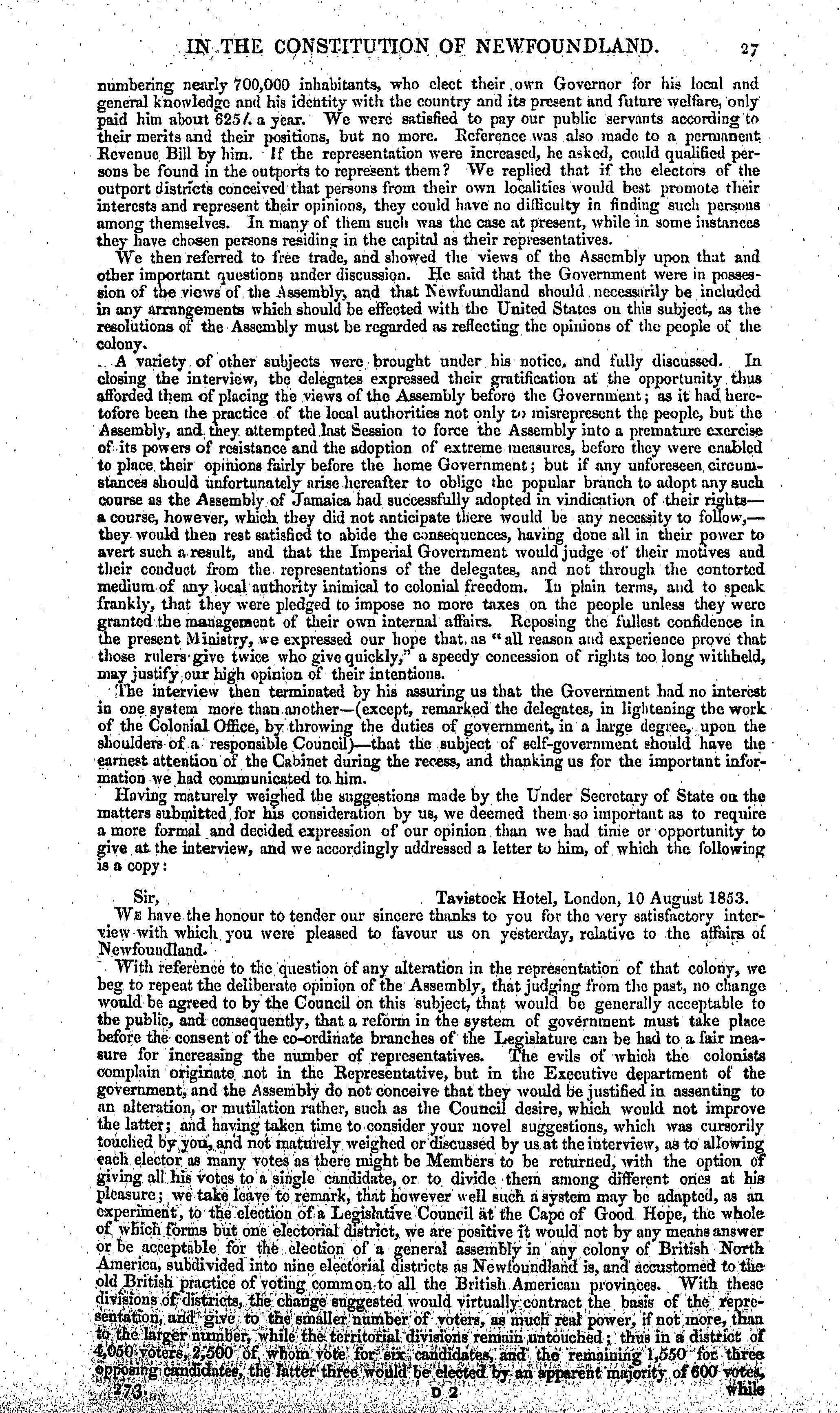 Cover title: Newfoundland : copies or extracts of correspondence between the Secretary of State and the Governor of Newfoundland, on the recent changes in the constitution of that colony.