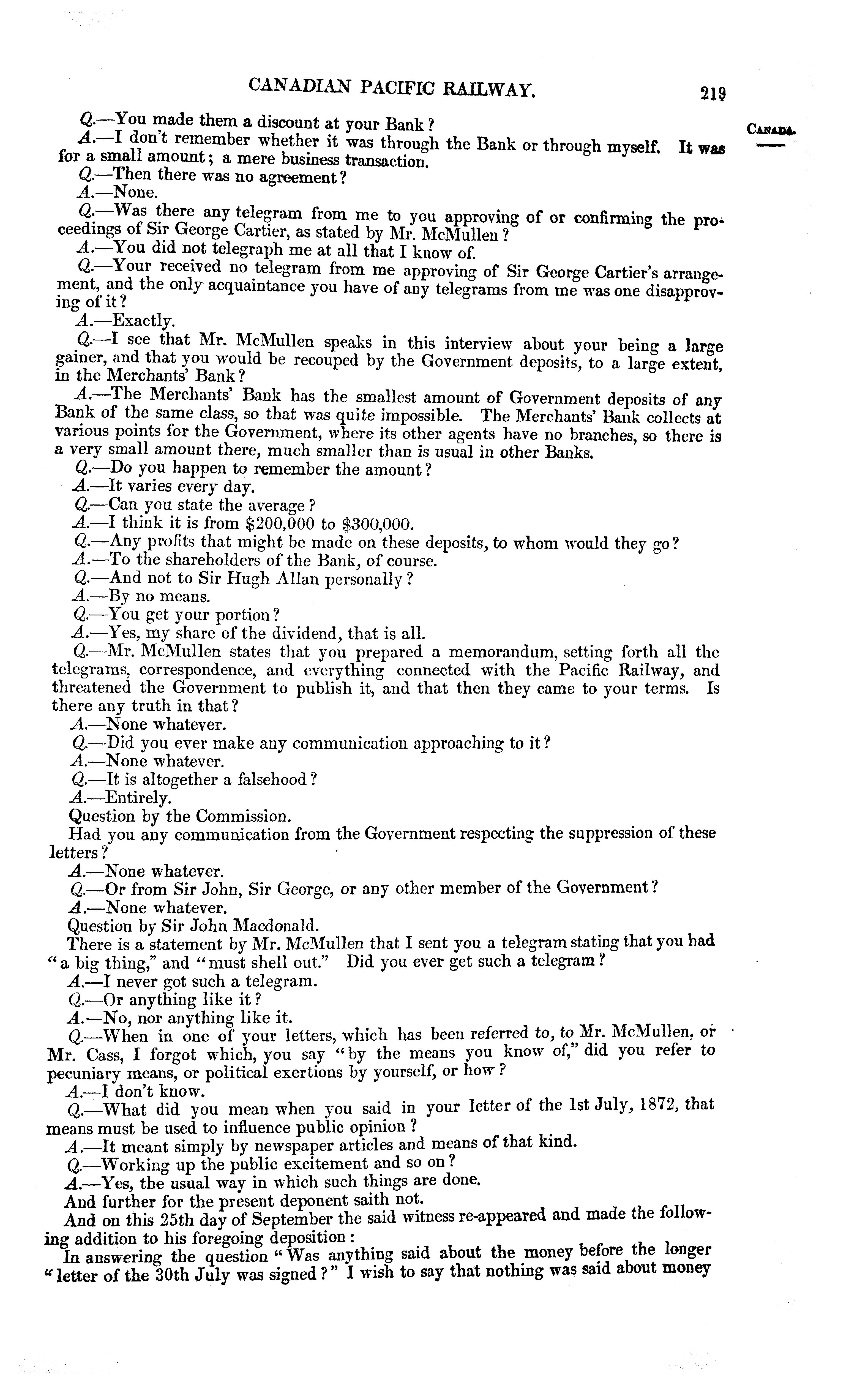 Relates to the Pacific Scandal.Title from title screen."Presented to both Houses of Parliament by Command of Her Majesty, March, 1874."Original issued in series: [Command papers / Great Britain. Parliament] ; Cd. 911.