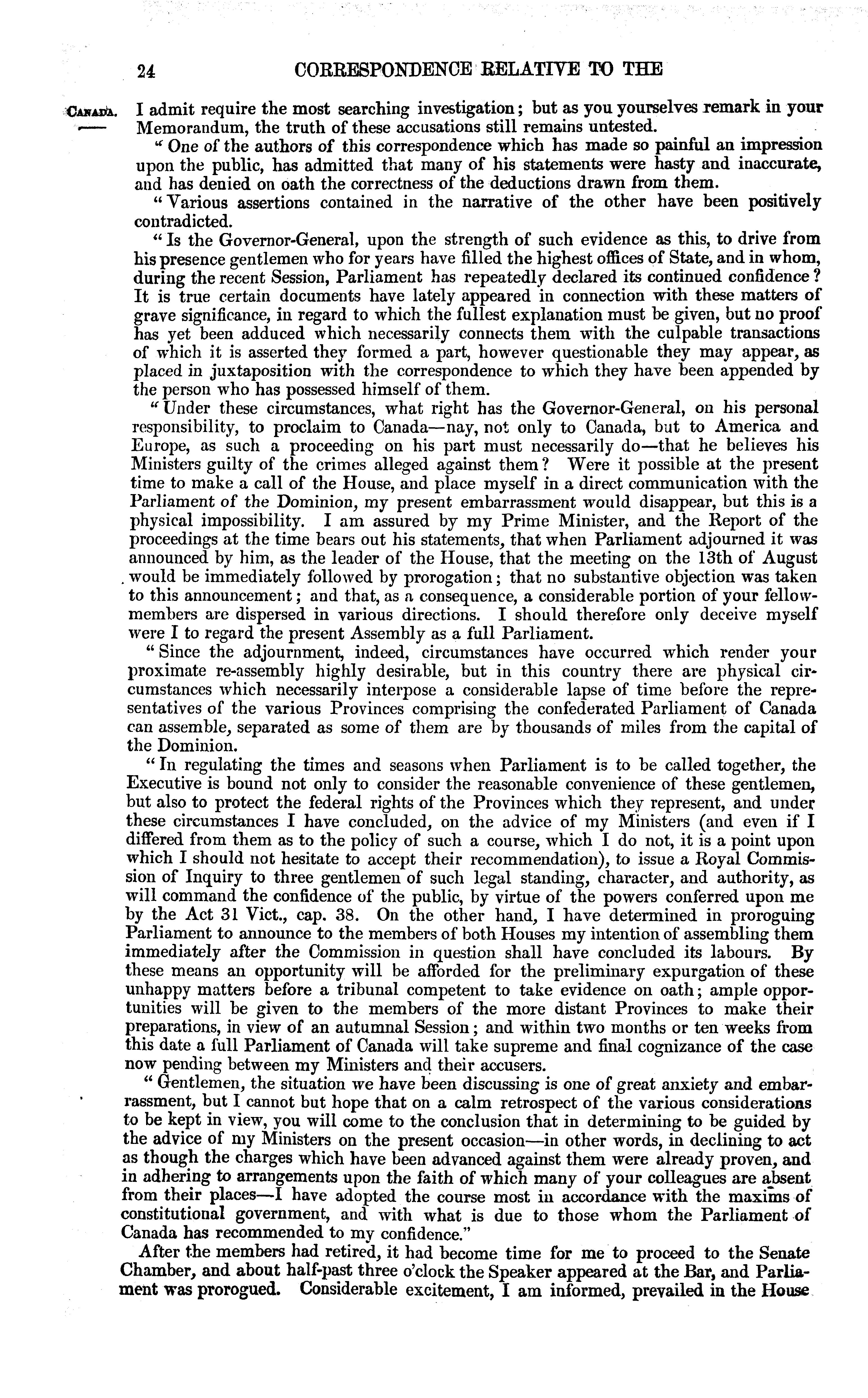 Relates to the Pacific Scandal.Title from title screen."Presented to both Houses of Parliament by Command of Her Majesty, March, 1874."Original issued in series: [Command papers / Great Britain. Parliament] ; Cd. 911.