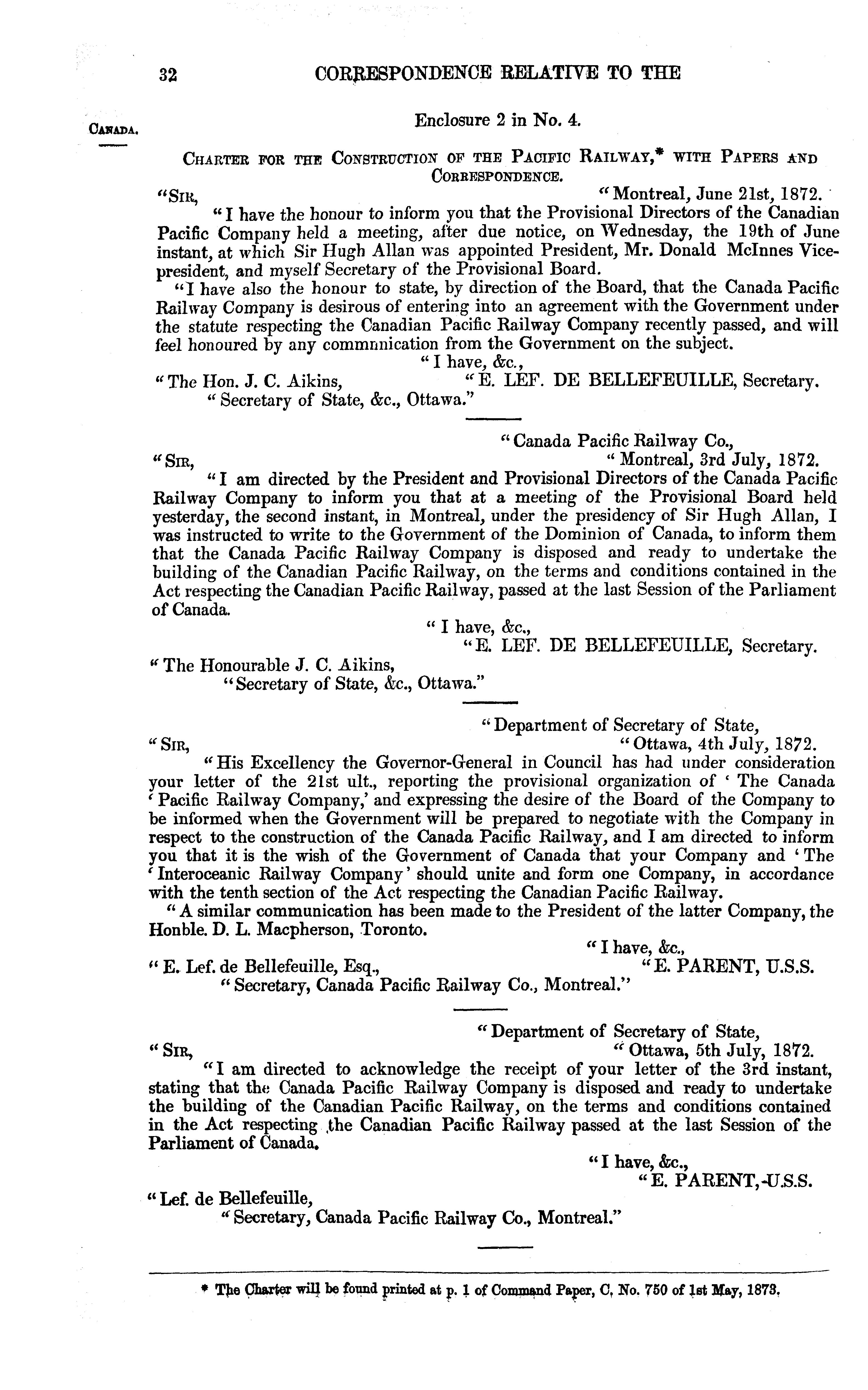 Relates to the Pacific Scandal.Title from title screen."Presented to both Houses of Parliament by Command of Her Majesty, March, 1874."Original issued in series: [Command papers / Great Britain. Parliament] ; Cd. 911.