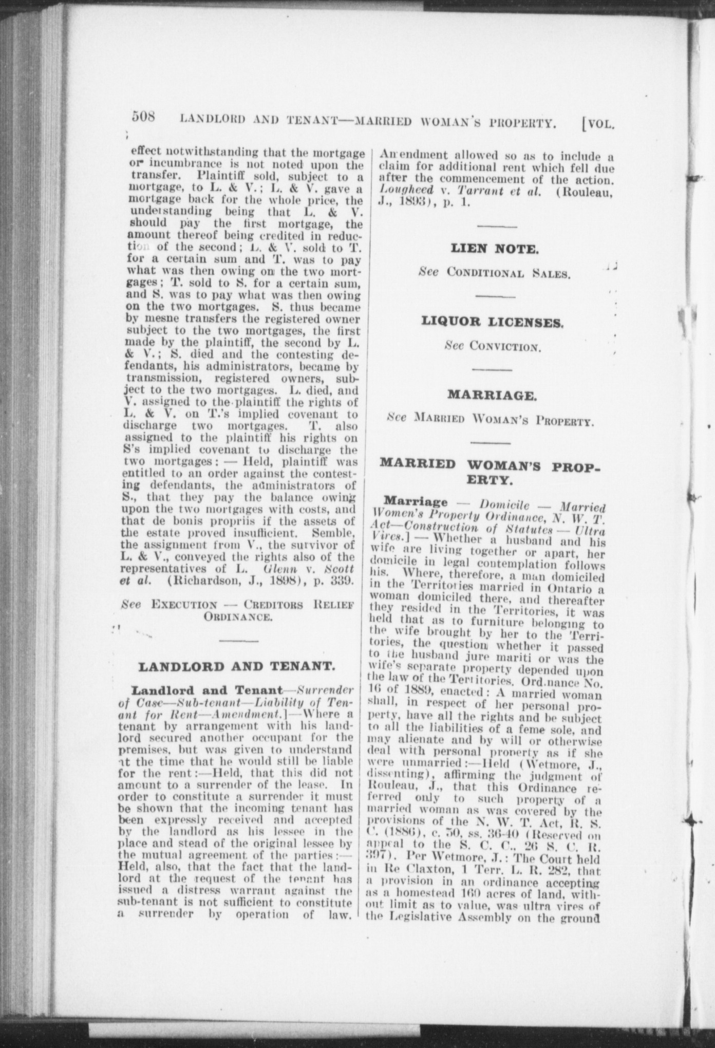 The Territories law reports : containing reports of cases decided in the Supreme Court of the North-West Territories, including revised reports of all cases hitherto reported in "The North-West Territories reports"