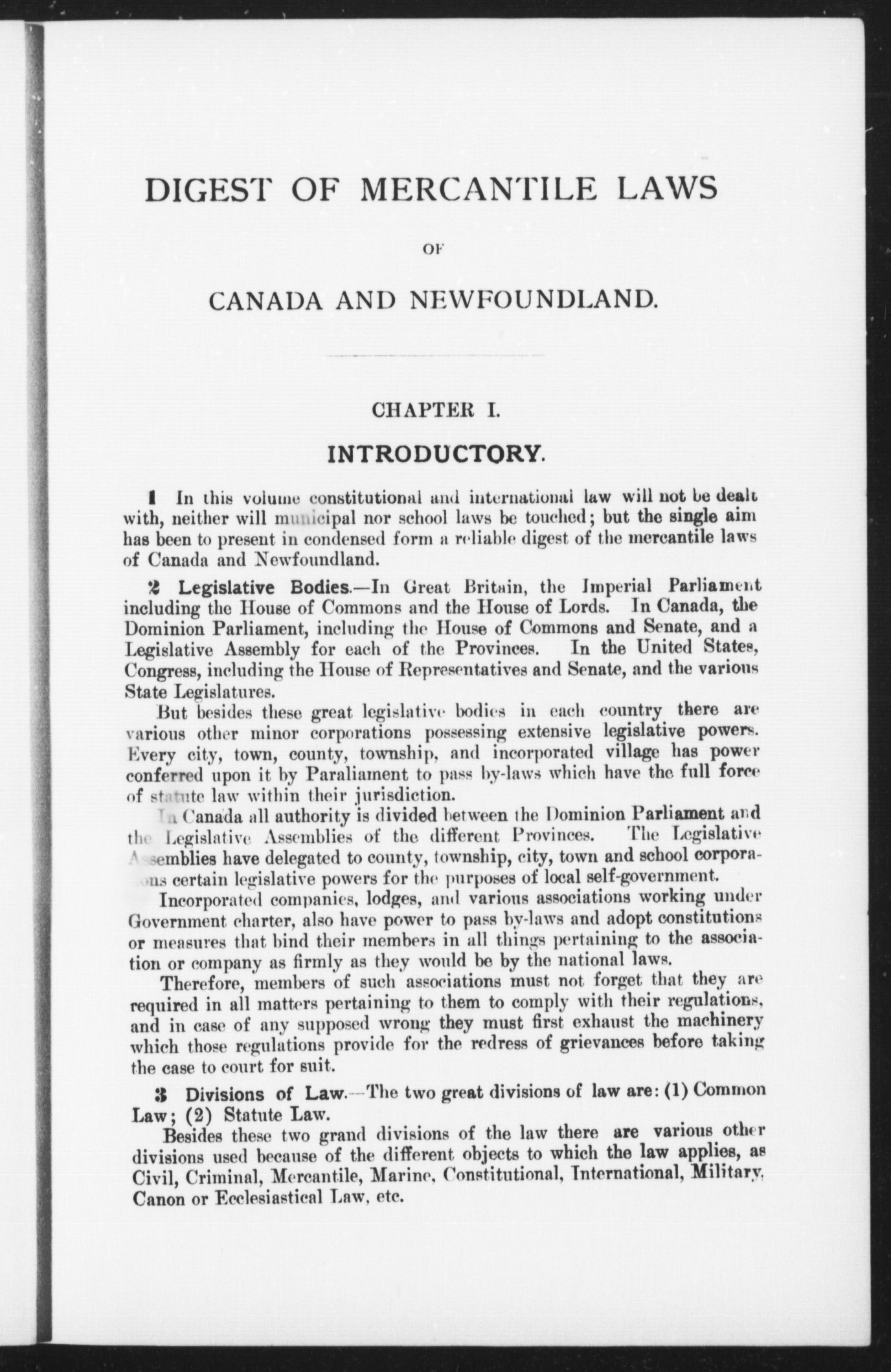Digest of the mercantile laws of Canada and Newfoundland : the technical points and main features of both the common and statute laws, together with the various legal and business documents in general use, forming a work of ready-reference for magistrates, conveyancers, professional and business men, landowners, contractors, etc. :lawyers will also find it convenient as a condensed and well-classified collection of most vital legal points for the various provinces