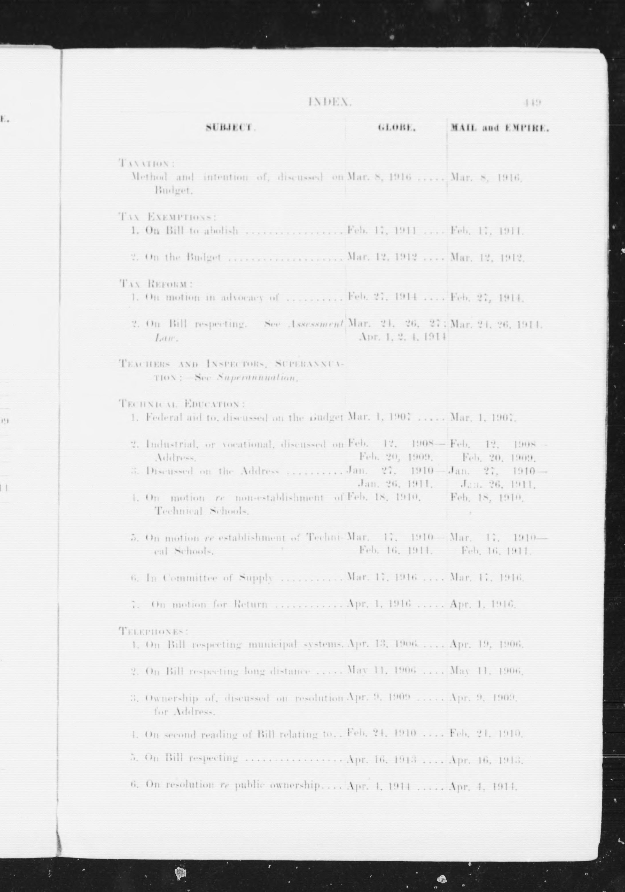 General index to the journals and sessional papers of the Legislative Assembly, Ontario 1913 to 1920, 3 George V, to 10 George V ; also, index to the divisions in House and lists of appendixes to journal for same period ; together with, index to debates and speeches, 1906 to 1920 /