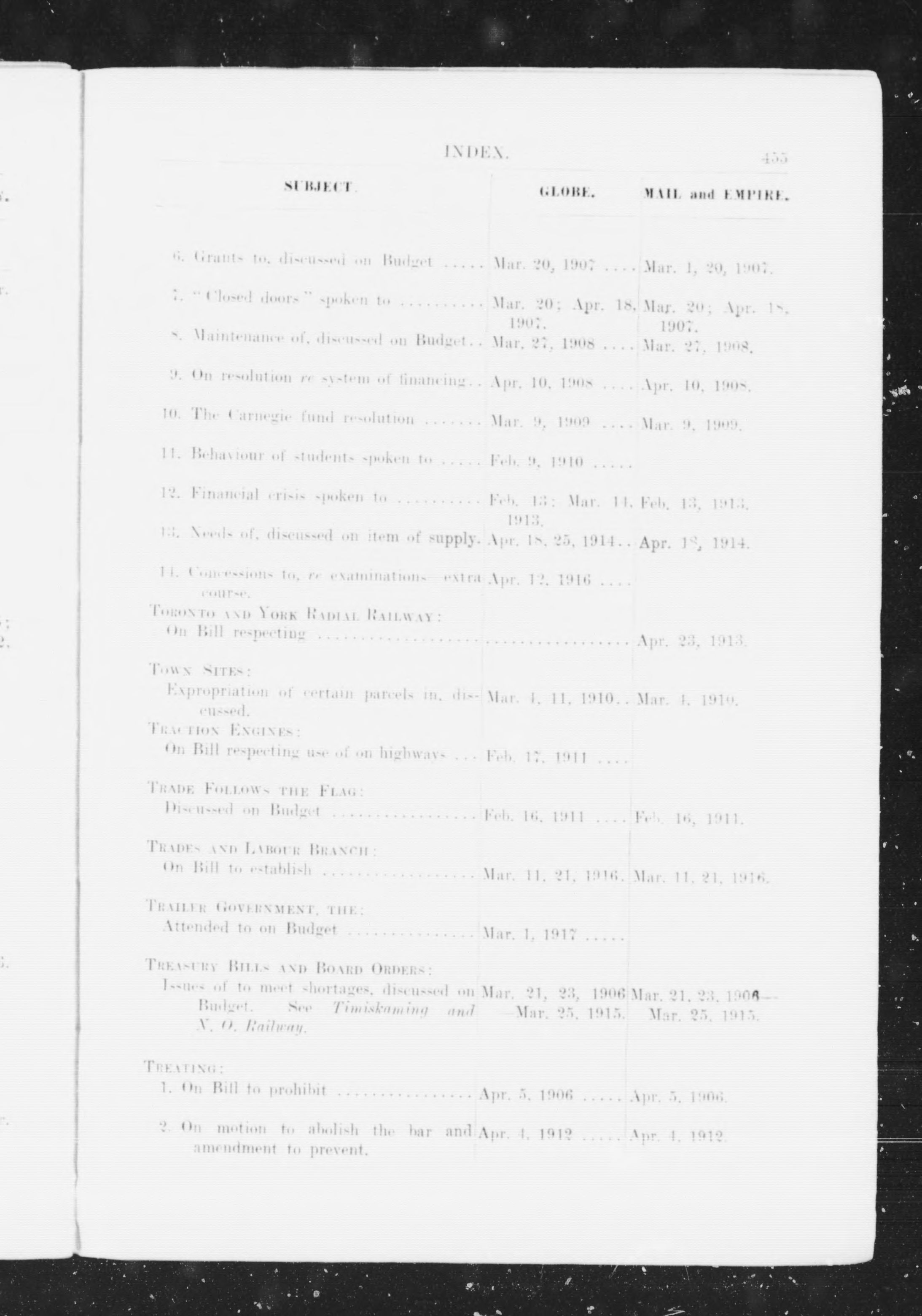 General index to the journals and sessional papers of the Legislative Assembly, Ontario 1913 to 1920, 3 George V, to 10 George V ; also, index to the divisions in House and lists of appendixes to journal for same period ; together with, index to debates and speeches, 1906 to 1920 /
