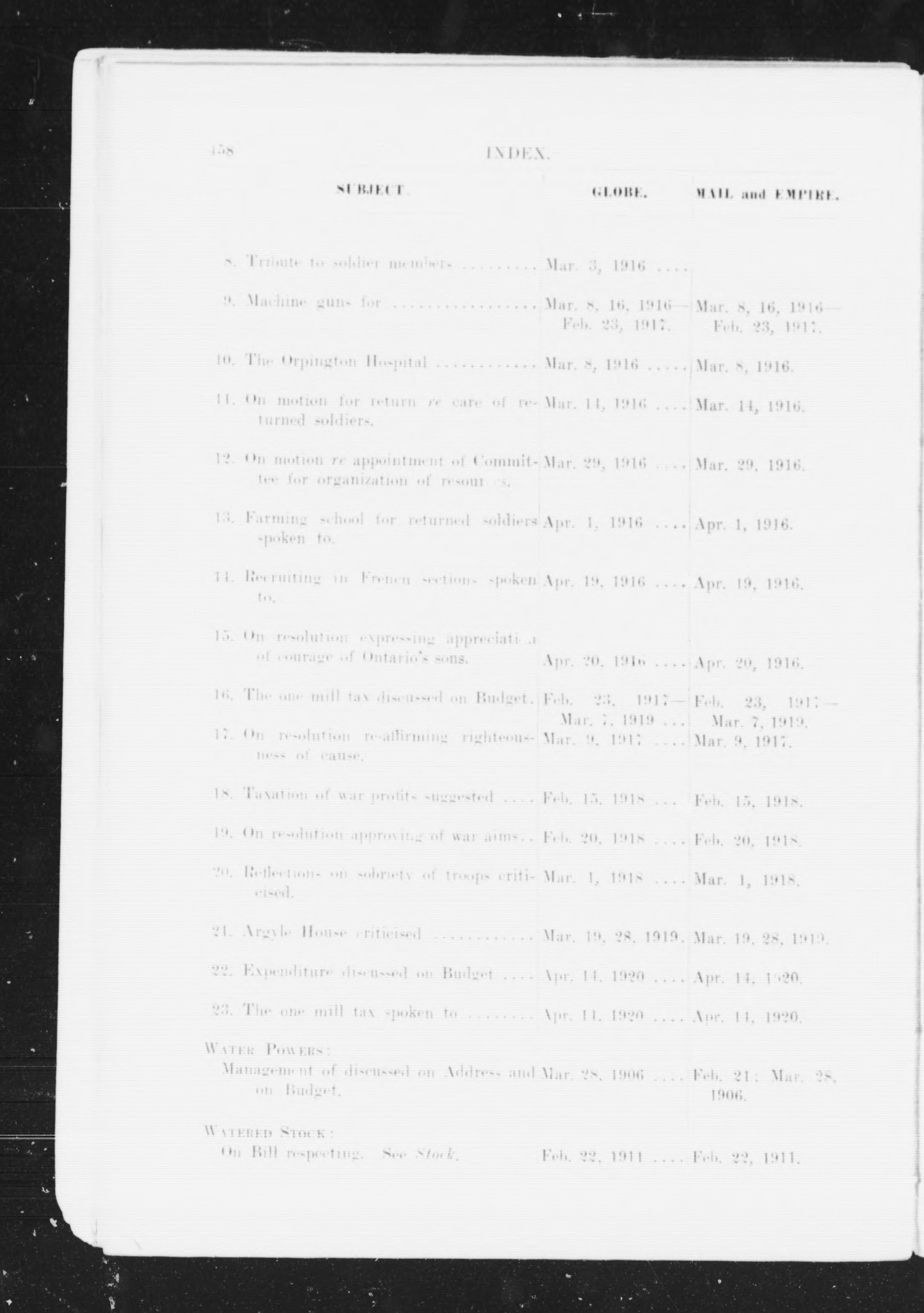 General index to the journals and sessional papers of the Legislative Assembly, Ontario 1913 to 1920, 3 George V, to 10 George V ; also, index to the divisions in House and lists of appendixes to journal for same period ; together with, index to debates and speeches, 1906 to 1920 /